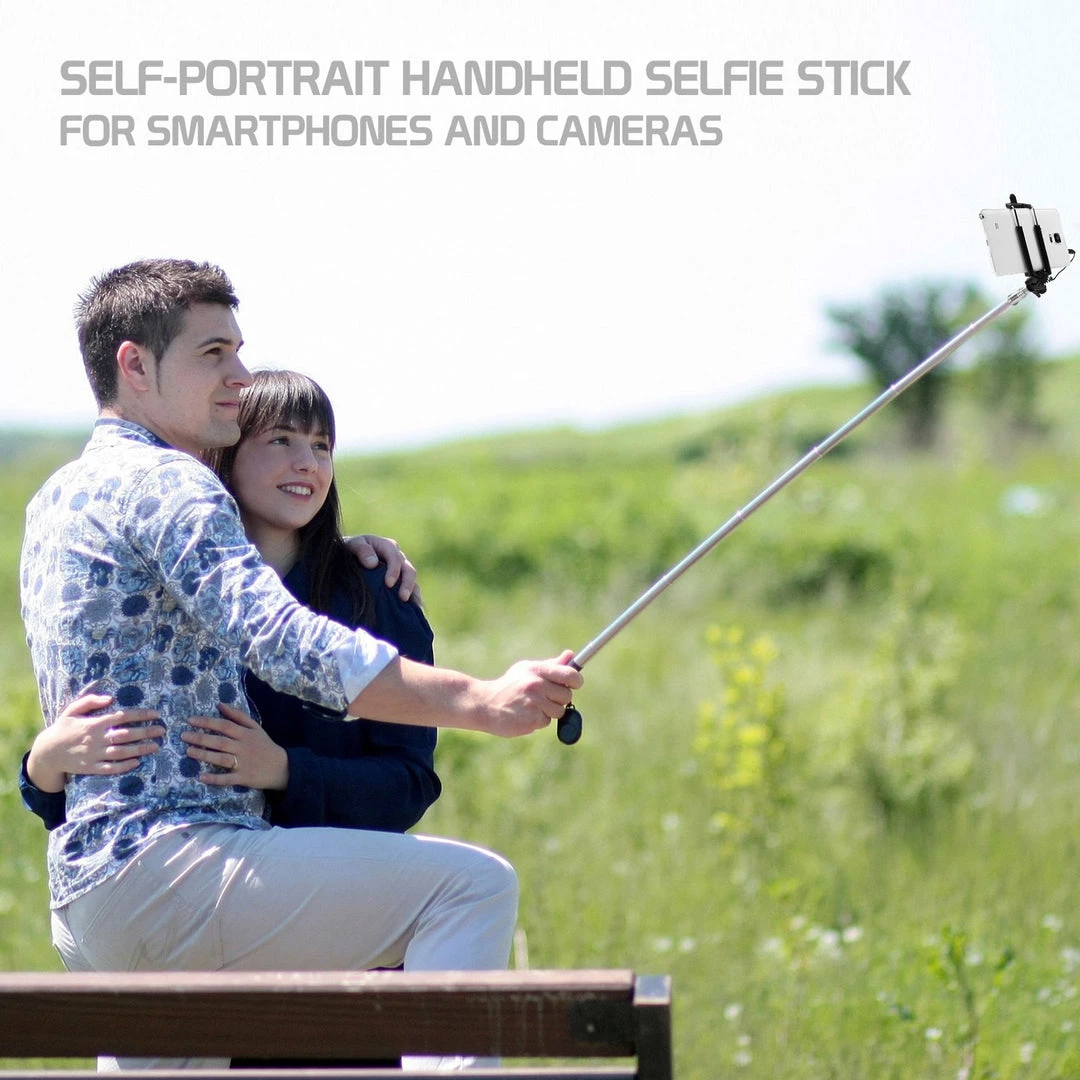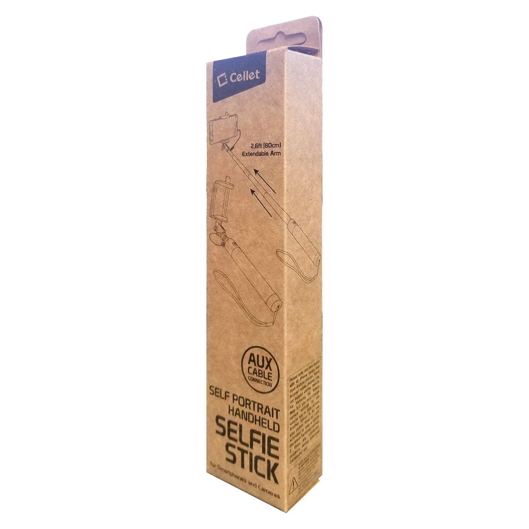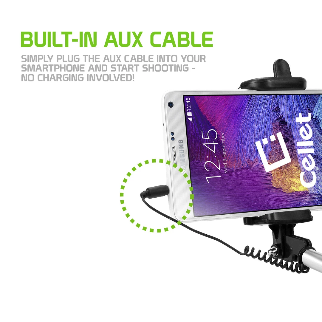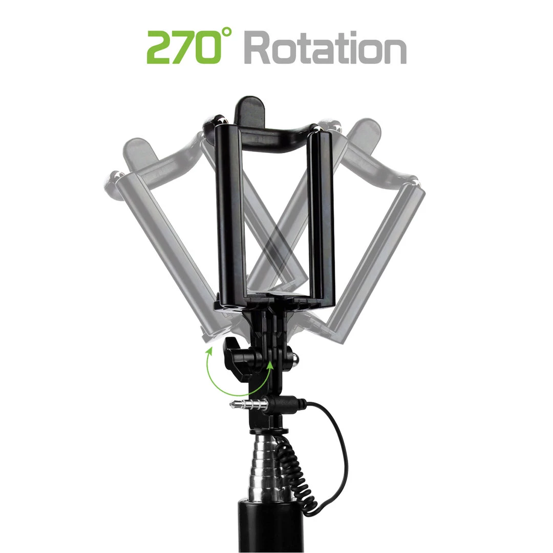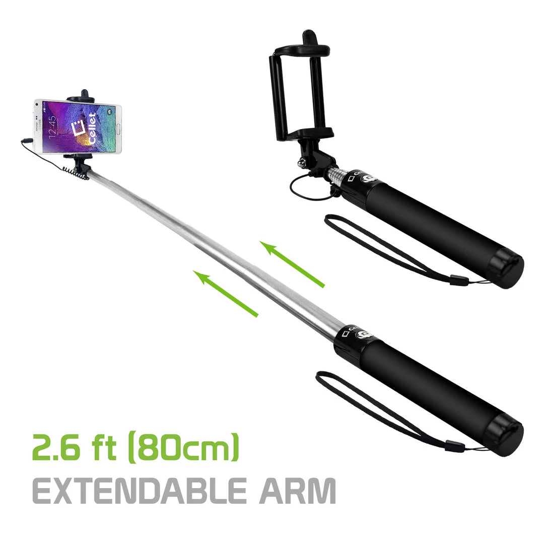 Featuring a built-in aux cable, just plug it into your headphone jack; it easily connects to your smartphone and takes great selfies at the touch of a button. Features on selfie stick include 270-degree rotational capability, shutter button, 2.6-foot extendable arm, holder to accommodate devices up to 3 1/2 inches wide, and turn knobs to secure the position of holder. Please note: this item works with iPhones and most Android phones.
