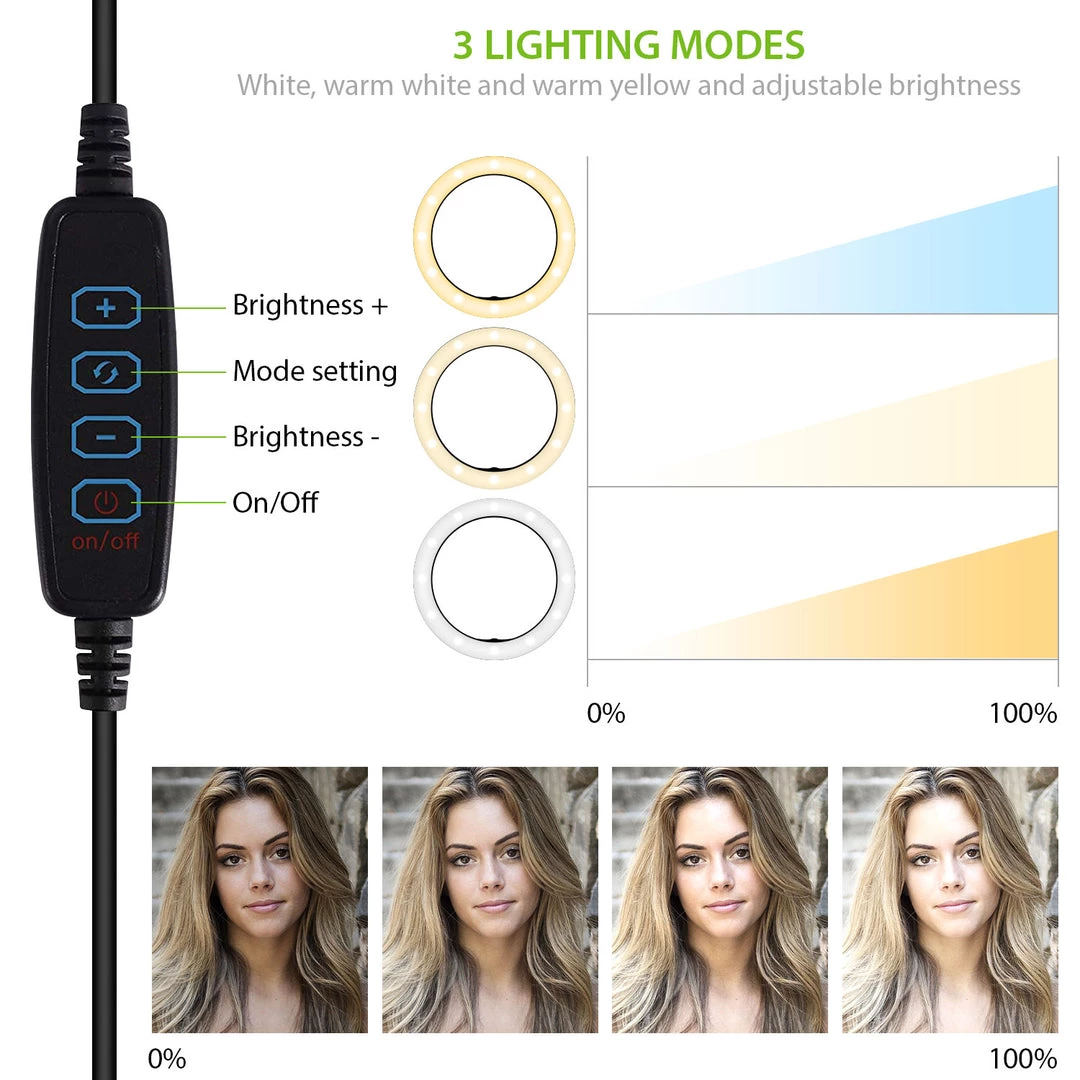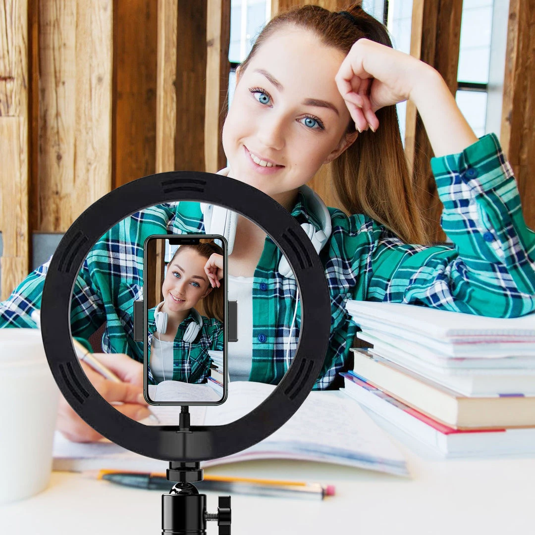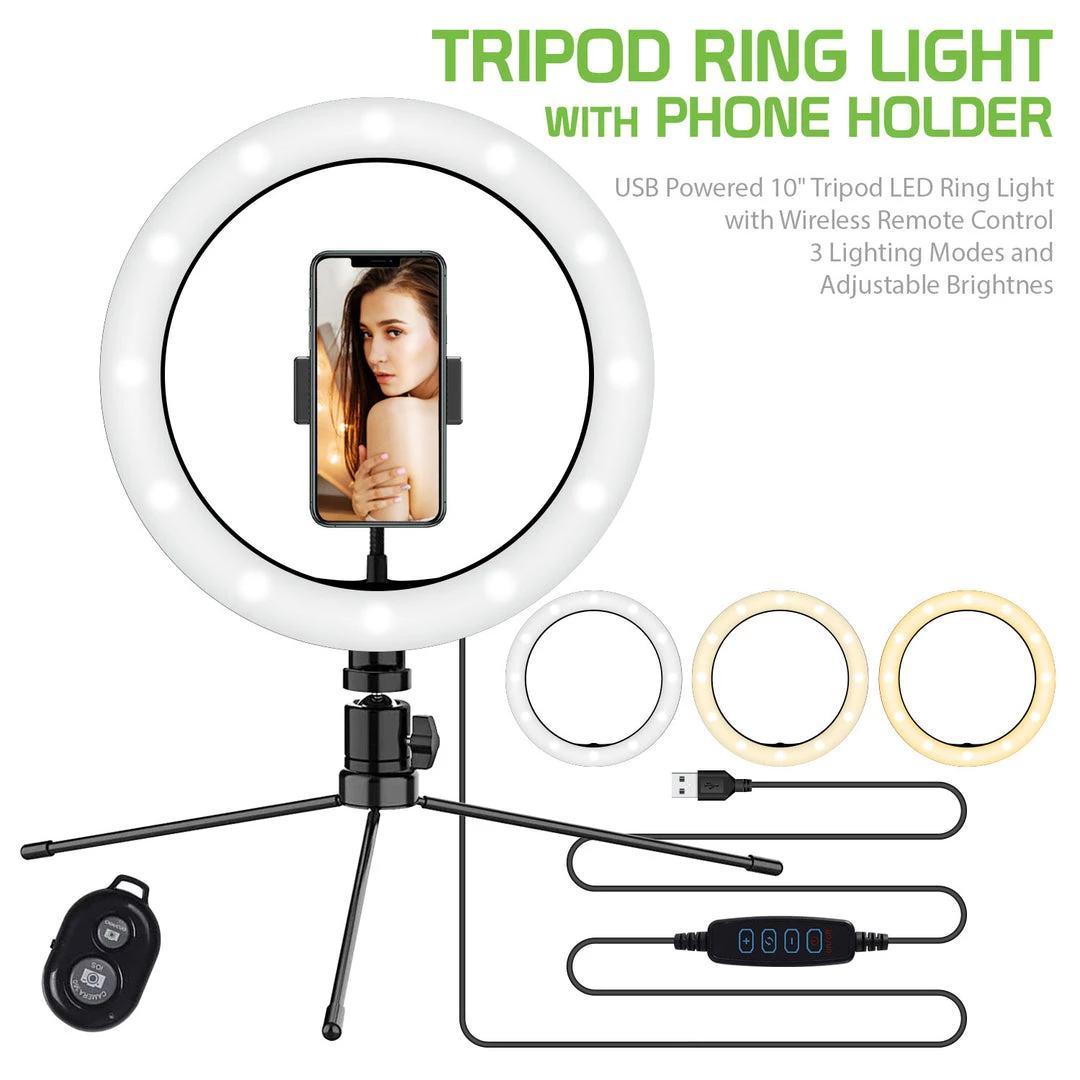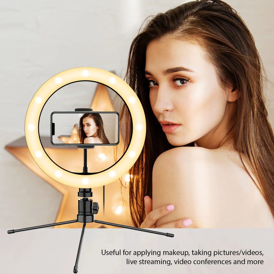 Use the 10″ Tripod LED Ring Light when filming videos, taking pictures, attending video conferences, and live streaming for the perfect lighting. The LED Tripod ring light is equipped with 3 lighting modes, white, warm white, and yellow, and adjustable brightness. Its compact, thin design makes it easy to store and carry, while not taking up much space when traveling. To use, simply place the base onto a table, desk, or any flat surface. Screw the phone holder onto the ring light. Next, screw the ball joint onto the base then screw on the ring light. The 4 button control allows you to turn the LED ring light on/on, change the lighting mode and adjust the brightness to your liking with ease. This LED ring light is USB powered (AC adapter not included) and equipped with an extra-long cable, no batteries are needed.Â