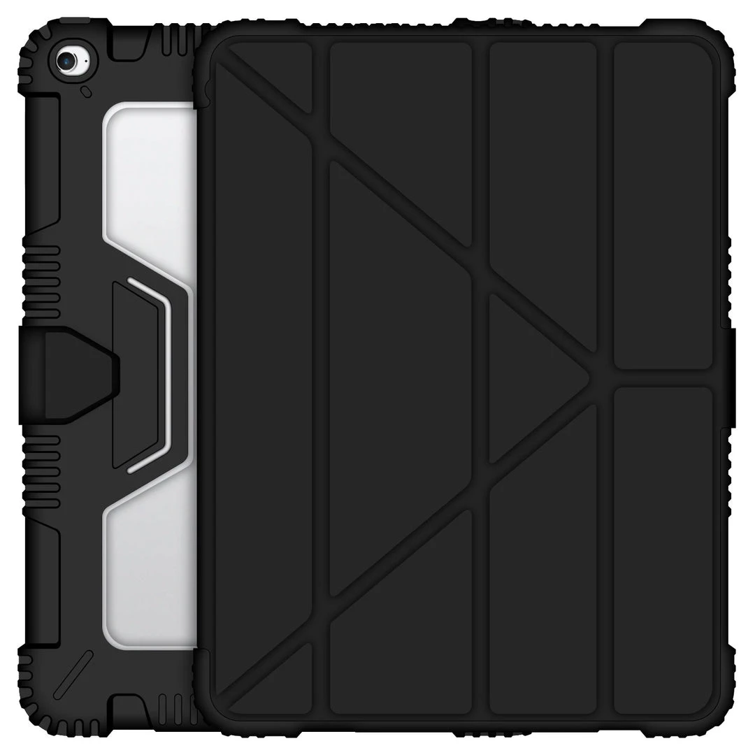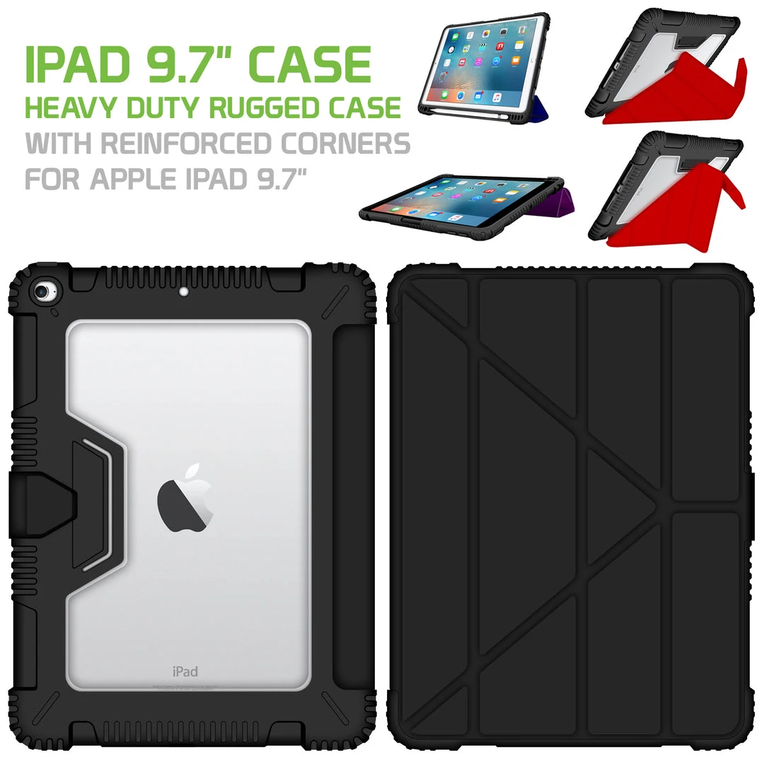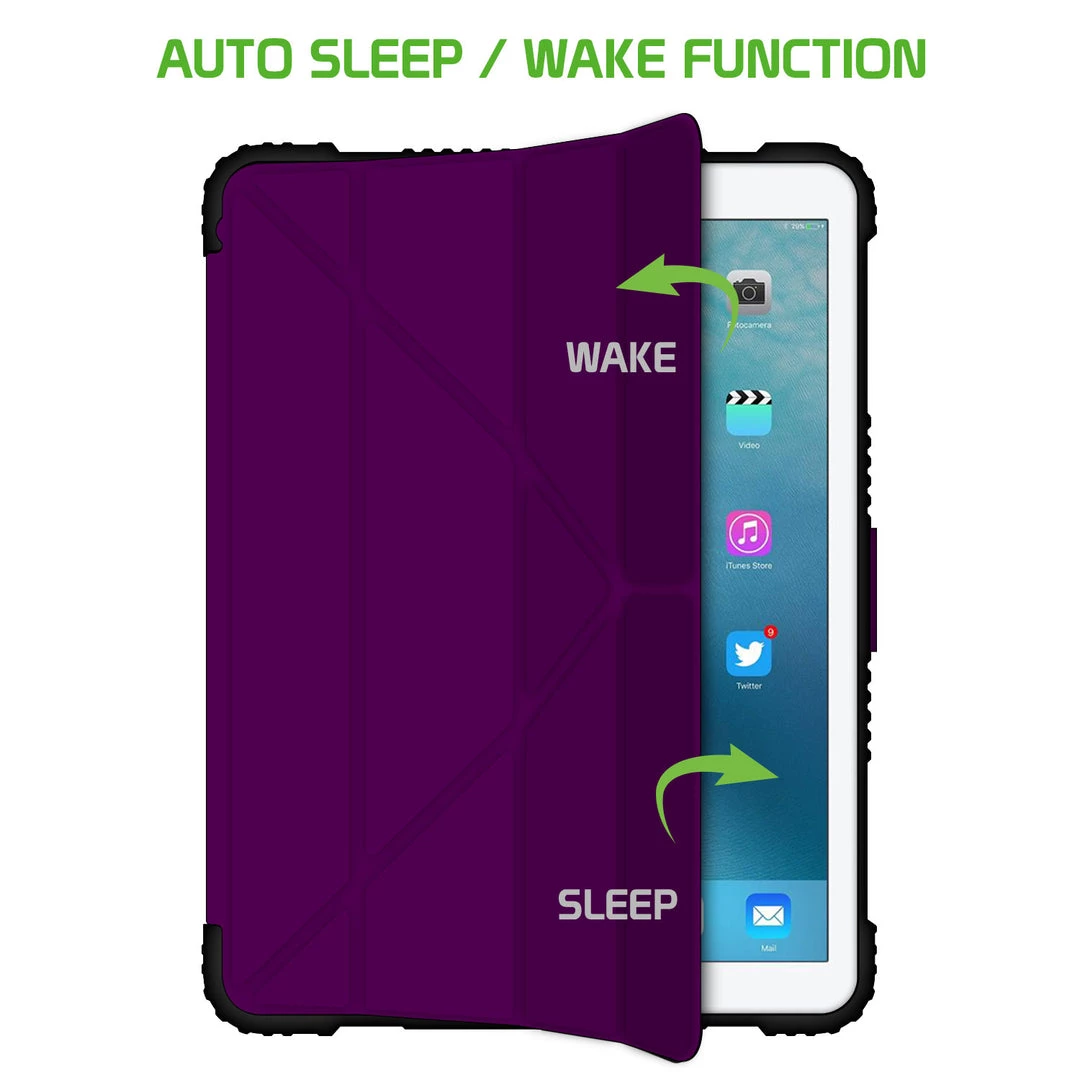 Made of polycarbonate (PC) and thermoplastic (TPU) materials, the Heavy Duty Rugged Case for your iPad 9.7″ provides excellent protection against scratches, dents, and other cosmetic imperfections. All-around raised bezel top prevents your camera lens and screen from touching any flat surface and reinforced corners deliver impact resistance from costly accidental drops. Use the trifold cover as a stand while watching videos or writing a paper. The cover can be folded up to three different ways for different viewing angles. Position your iPad at a 30 or 65-degree angle. Built-in tactile buttons are highly responsive and precise cutouts do not hinder accessibility to buttons, controls, bottom speaker, and lightning port. Made of tough polycarbonate materials, this case was designed to withstand hard drops, scratches, and abrasions. Together with 360-degree protection, reinforced edges, rubberized skid pads, and raised bezel, your device is fully protected while minimizing size and weight.