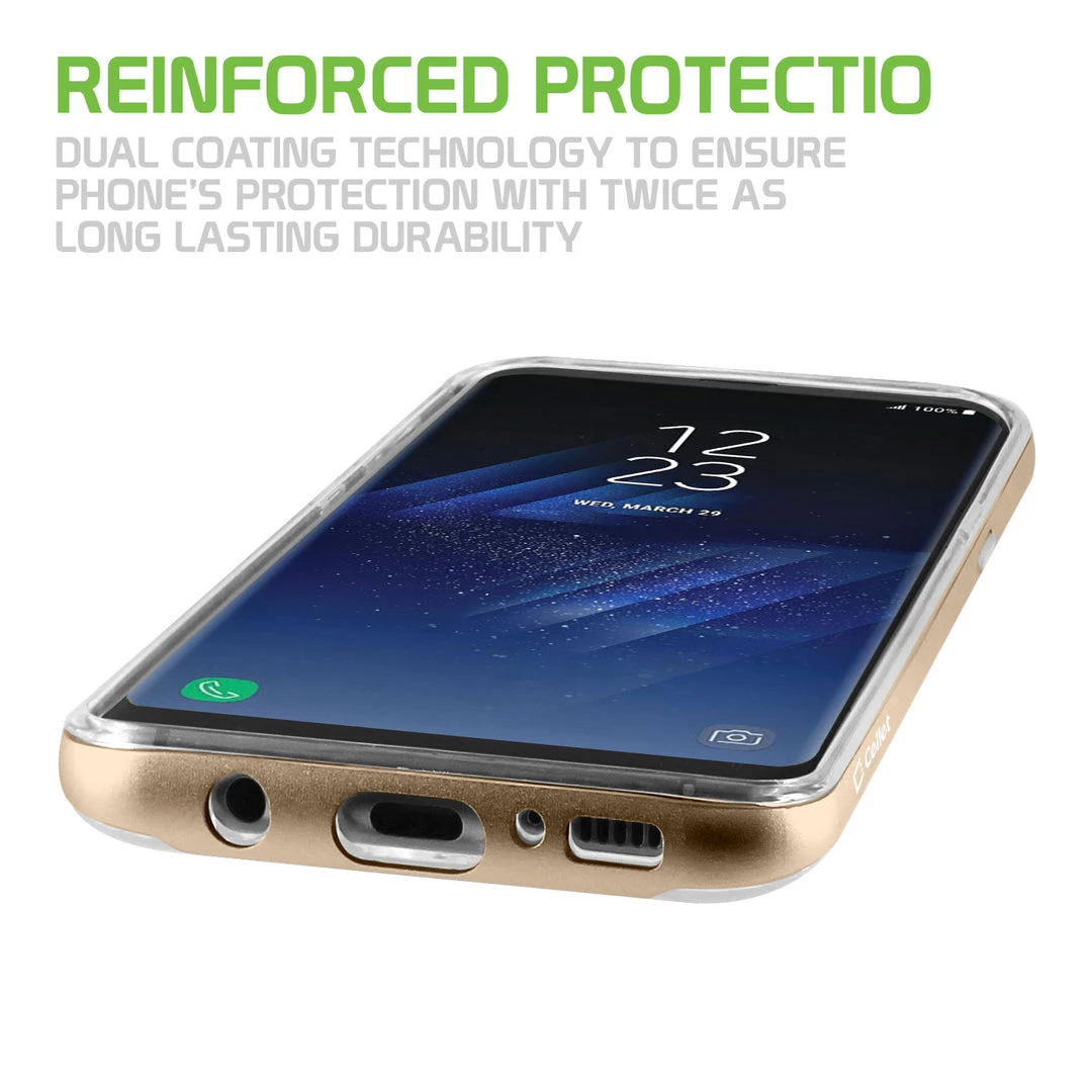 A transparent, dual, drop protective TPU case for Samsung Galaxy S8 contains a shockproof bumper with a convenient slim fit without extra bulk to your device. The duo case contains a frame bumper with precise cutouts which allow access to buttons, controls, bottom speaker, and USB port. The bumper tough frame will hug your phone and protect it against day-to-day inconvenient drops and scratches. Due to the case being transparent you can portray the color of your phone with the added hint of metallic. Your device can have a professional yet stylish look.Â
