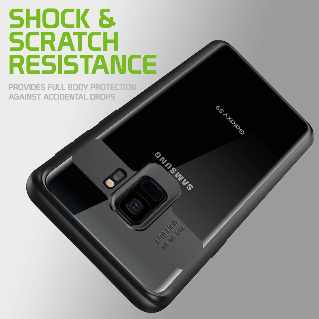 Composed of flexible TPU material with anti-slip properties, this case provides all-around protection against accidental drops. The durable PC plastic protects your Samsung Galaxy??S9’s exterior from any scratches. The ultra-slim design minimizes any bulkiness to maintain a comfortable grip on your device. Built-in tactile buttons are highly responsive and precise cutouts do not hinder accessibility to the ports or buttons.