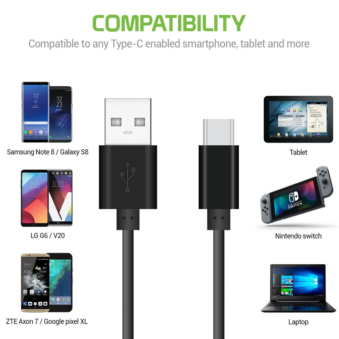 Obtain the content in your device with our cleverly designed type A to C data cable. Sync and transfer your files from your computer to your device or charge your device or vice versa. High power (2.4Amp) availability to charge your device with an AC wall adapter (not included) at a rapid rate. Type A to C cable simplifies your connection, simply plug the cable into your phone and transfer content easily. The cable length of 3.3ft offers freedom to connect your device to a wall charger or to your laptop. This cable is compatible with smartphones, tablets, cameras and other type C enabled devices.