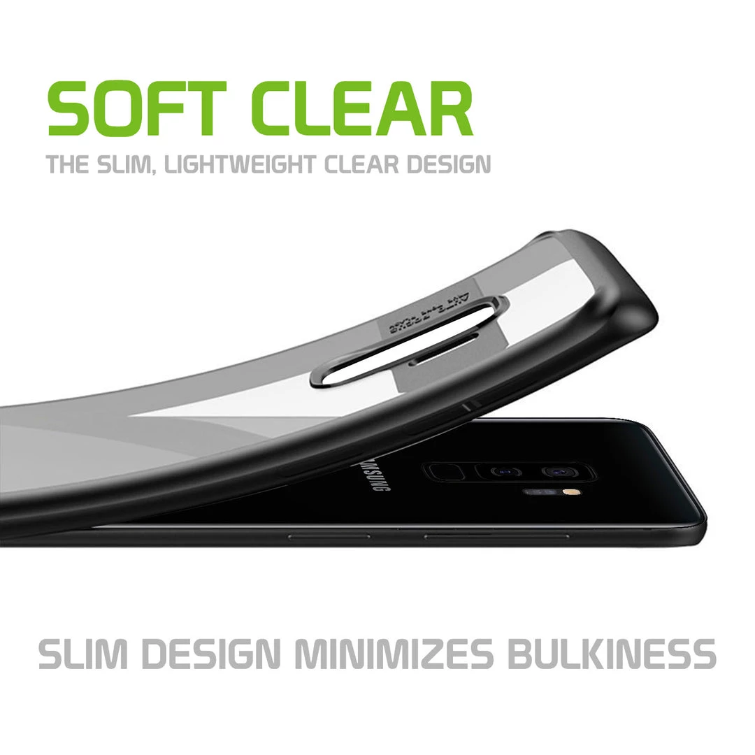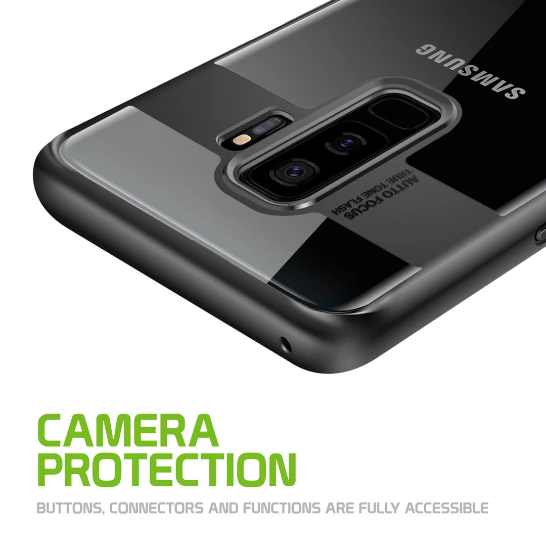 Composed of flexible TPU material with anti-slip properties, this case provides all-around protection against accidental drops. The durable PC plastic protects your Samsung Galaxy S9 Plus’s exterior from any scratches. The ultra-slim design minimizes any bulkiness to maintain a comfortable grip on your device. Built-in tactile buttons are highly responsive and precise cutouts do not hinder accessibility to the ports or buttons.