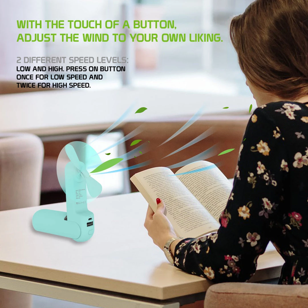 2000 mAh long-lasting battery, battery life is approximately 10 to 20 hours. 2 speed levels: low and high. Press on the button once for low speed and twice for high speed. LED indicator lights. The red light will flash when your device is low battery, a flashing white light indicates the fan is charging, and lights will turn off once the fan is fully charged. A micro USB charging cable is included inside the box (AC adapter sold separately). Charging time: approximately 3 to 4 hours. Multi-purpose Mini fan for hot summer days, outdoor activities, or in-office/library. Minimal noise making; Small portable slim power bank with a built-in flashlight for camping, power outages, or for on-the-go activities.