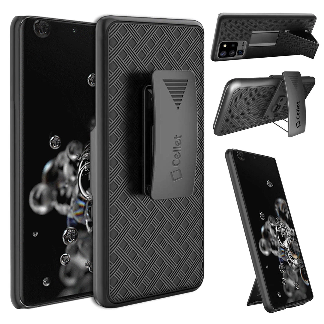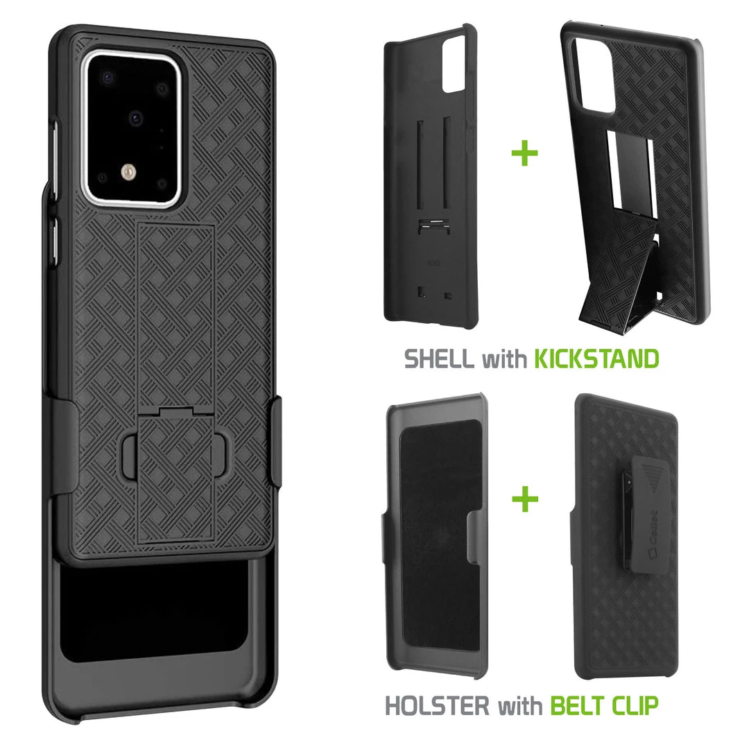 Combining protection with functionality, this shell plus holster case lets you carry your device with ease while providing maximum all-around protection. Built-in media kickstand on the holster and shell allows viewing in landscape (horizontal) or portrait (vertical) orientation and the heavy-duty clip has 180-degree rotation. Rubberized finish and cross-checkered design act as an extra precautionary step against accidental cosmetic damage. The slim profile and the multi-functionality of this product merge style, versatility, and superior protection.