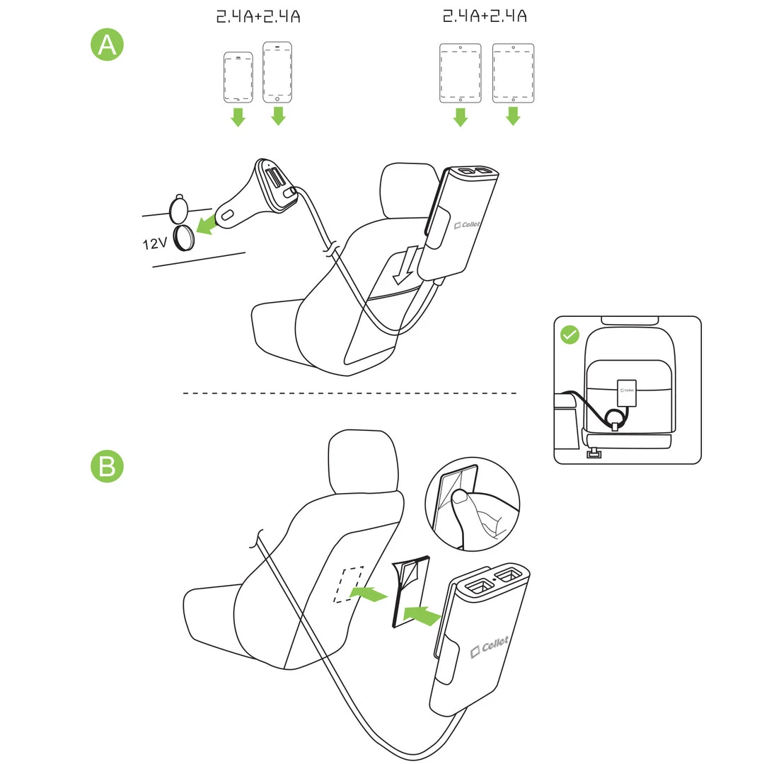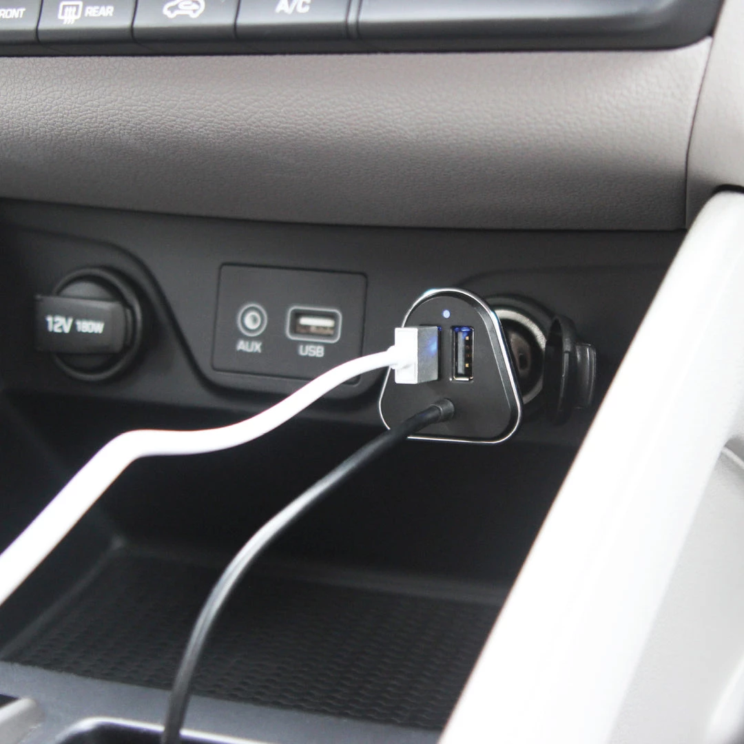 - The extendable hub allows backseat passengers to also charge 2 tablets simultaneously at 2.4A per port