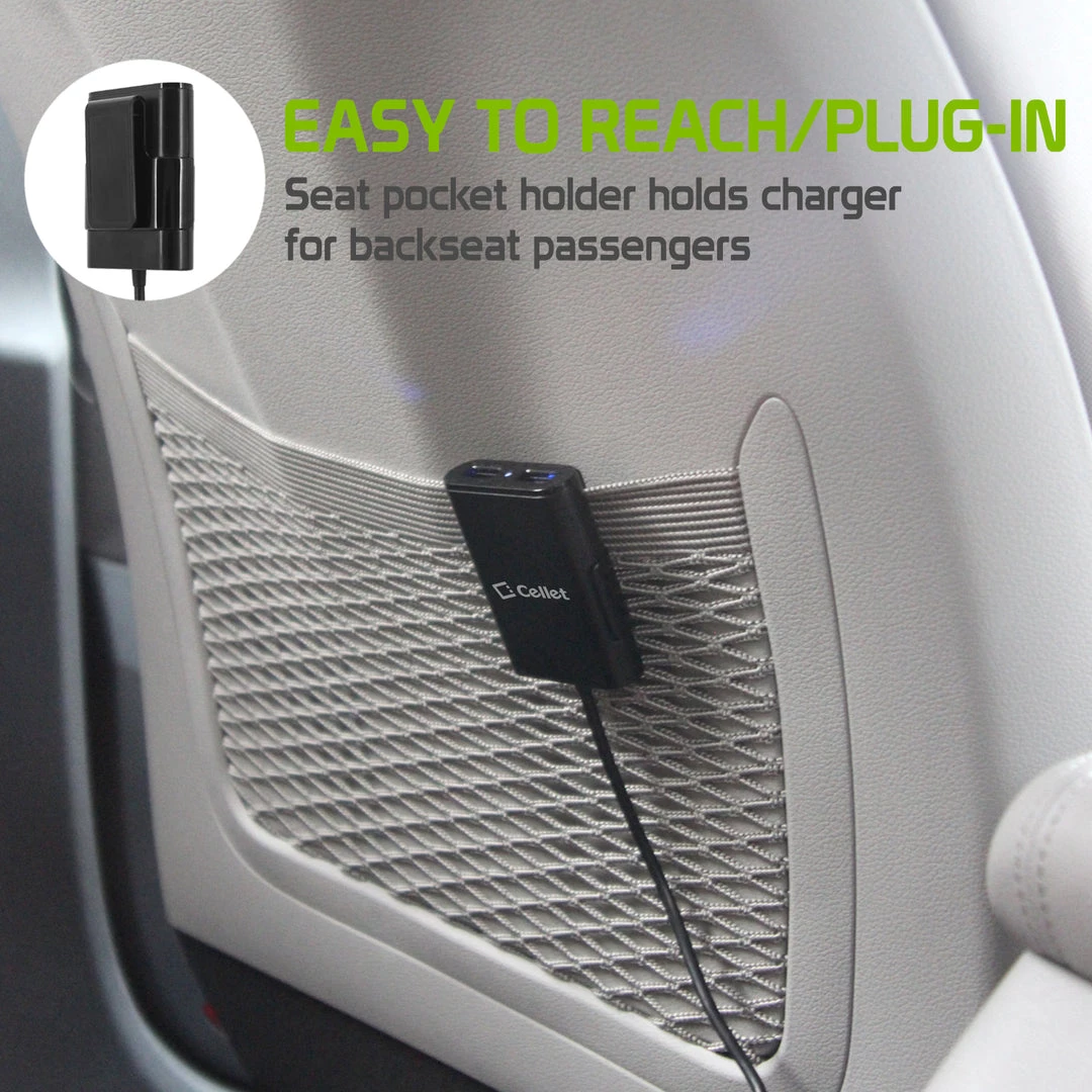 Charge 4 devices at the same time and keep everybody happy with Cellet’s 4 USB port car charger. The 6ft cable runs from the front seats to the back seats of your car easily. Sharing chargers becomes a thing of the past with 4 ports handling everybody’s needs, with each port providing 2.4A of output.? The extending USB Hub allows back seat passengers to power their devices, making it easy for kids to watch a movie on their tablets, keep travelers occupied on a long trip, etc.