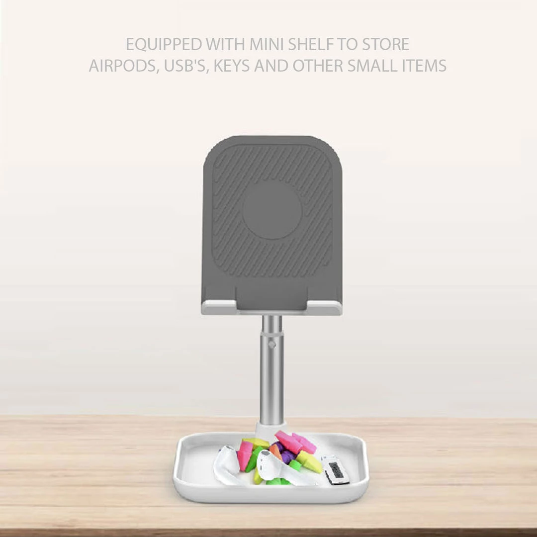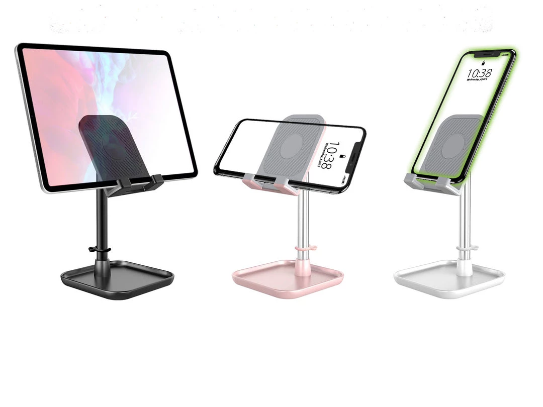 Place the holder onto any table, desk, or flat surface to enjoy watching your favorite shows or review your favorite recipe on your tablet/smartphone with ease using the smartphone and tablet display stand. Constructed with high quality aluminum and equipped with a non-slip weighted base for enhanced stability. Non-slip rubberized silicone backings were added to the cradle for extra protection to maintain a secure grip on your device. With a 45 degree tilt rotation and height adjustment of 182-272 mm, it offers multiple viewing positions. It also offers two viewing angles ? portrait or landscape orientation. The desktop smartphone holder is also equipped with a mini shelf, store important items such as your AirPods and keys to avoid misplacing them.