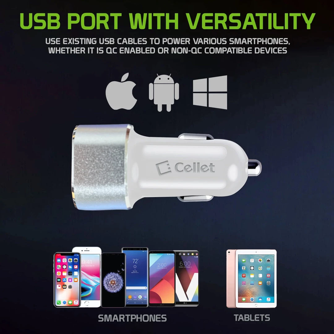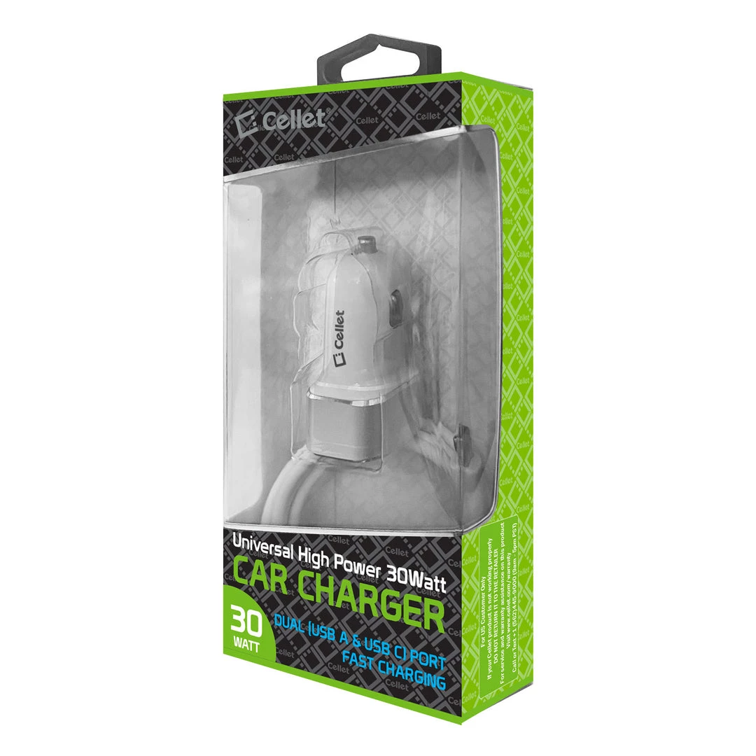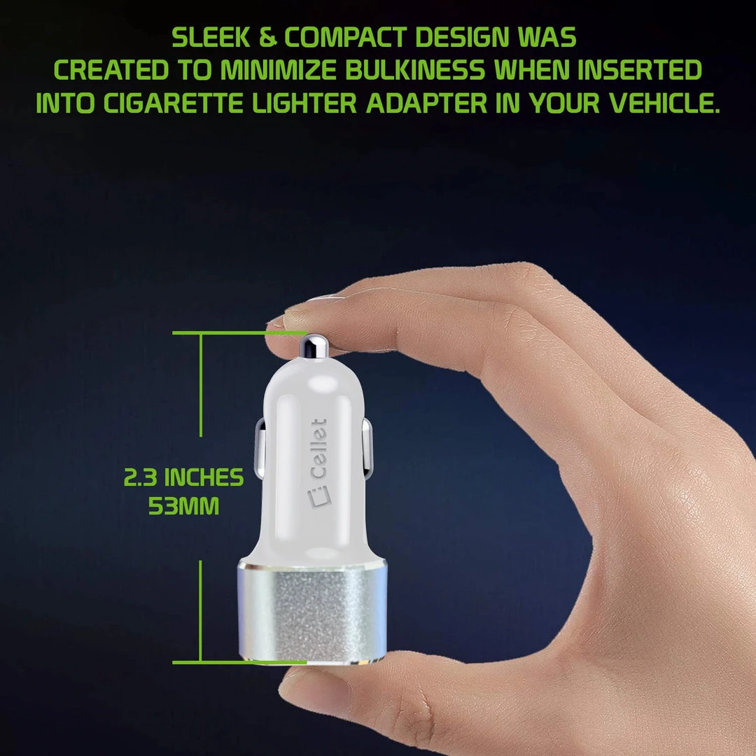 Equipped with two (2) USB ports for maximum compatibility, you can charge two devices simultaneously with the Cellet high-power car charger. Our dual USB charger contains one USB-A port and one USB-C port. You can charge devices such as your iPhone 13 Pro Max, Samsung Galaxy S22 Ultra, iPads, tablets, digital cameras, and more with existing USB cables. Built-in technology protects your device from over-current, overcharging, and overheating. Its sleek and compact design was created to minimize bulkiness when inserted into a cigarette lighter adapter in your vehicle. The convenient compact size allows you to store it easily in your glove compartment or your computer bag.