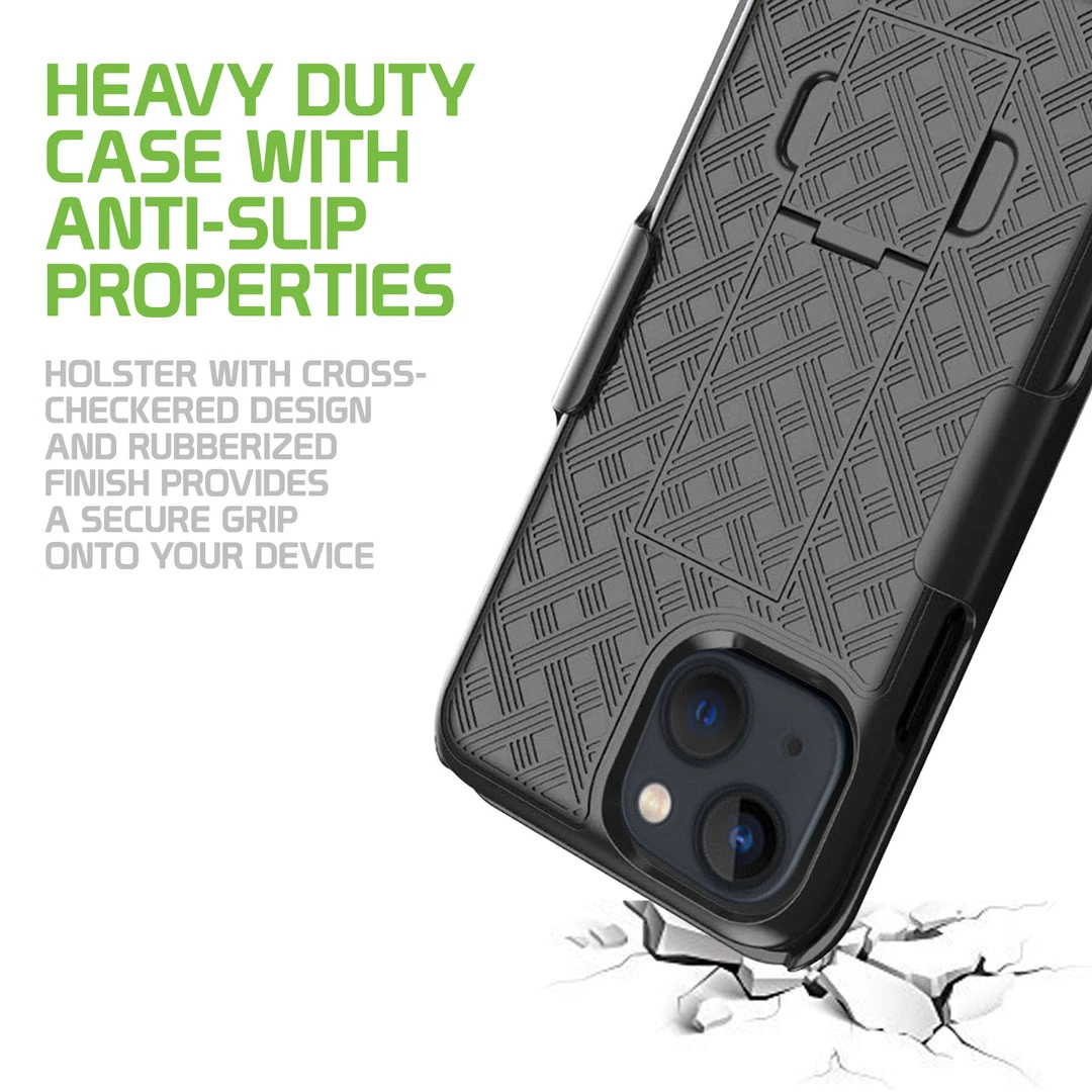 Combining protection with functionality, this shell plus holster case allows you to carry your device with ease while providing maximum all-around protection. Built-in media kickstand allows viewing in landscape (horizontal) or portrait (vertical) orientation. The case easily slips into the heavy-duty holster, so you can carry your phone either face up or face down. In addition, the belt clip includes 180-degree rotation capability so you can position the holster at any desired angle. The holster and hard shell combo case comes in all black and contains TPU, rubberized soft coating, which aids as an extra step of precaution against accidental cosmetic damage. Look no further! The slim profile and the multi-functionality of this product merge style, versatility, and supreme protection.