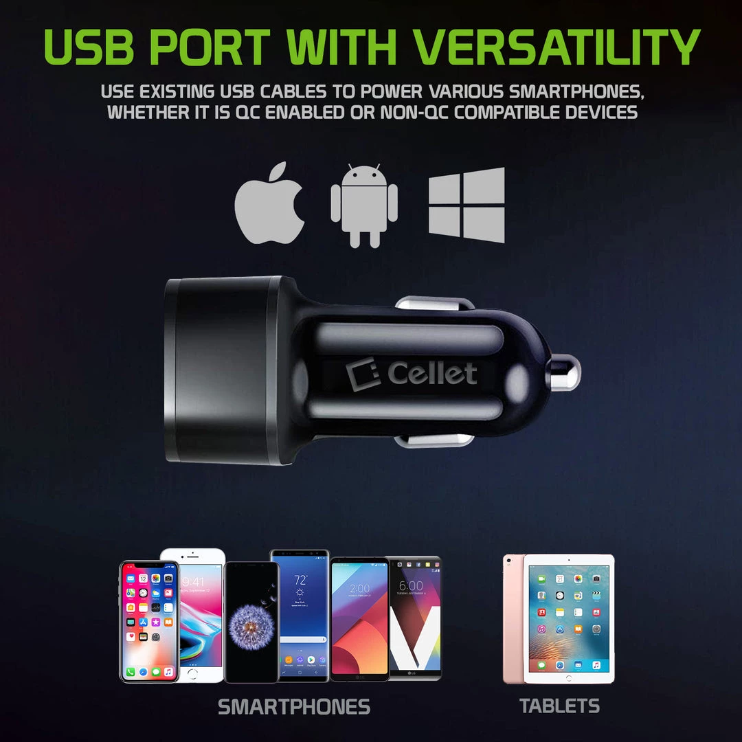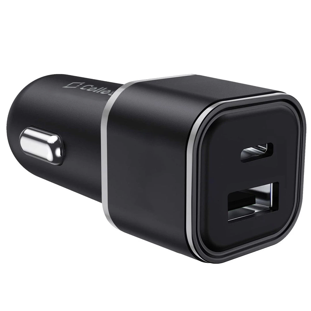 Equipped with two (2) USB ports for maximum compatibility, you can charge two devices simultaneously with the Cellet high-power car charger. Our dual USB charger contains one USB-A port and one USB-C port. You can charge devices such as your iPhone 8/8 Plus, Samsung Galaxy S9/S9 Plus iPhone 7, 7 Plus, iPads, tablets, digital cameras, and more with existing USB cables. Built-in technology protects your device from over-current, overcharging, and overheating. Its sleek and compact design was created to minimize bulkiness when inserted into a cigarette lighter adapter in your vehicle. The convenient compact size allows you to store it easily in your glove compartment or your computer bag.