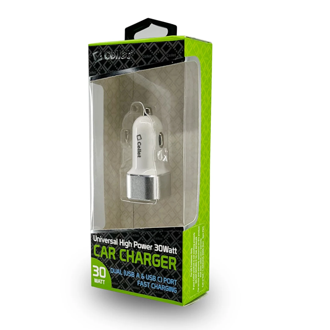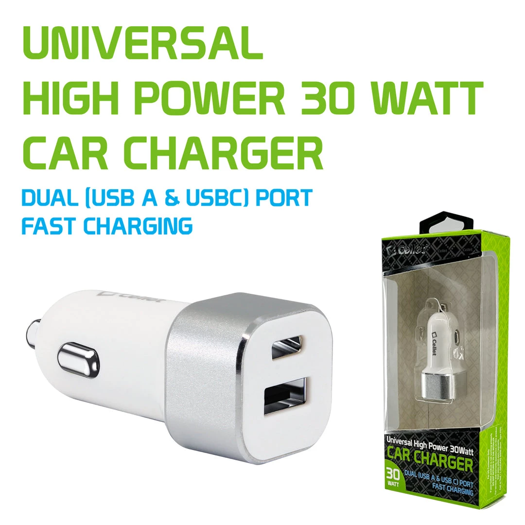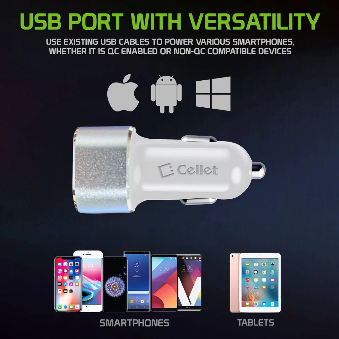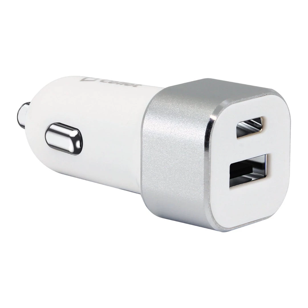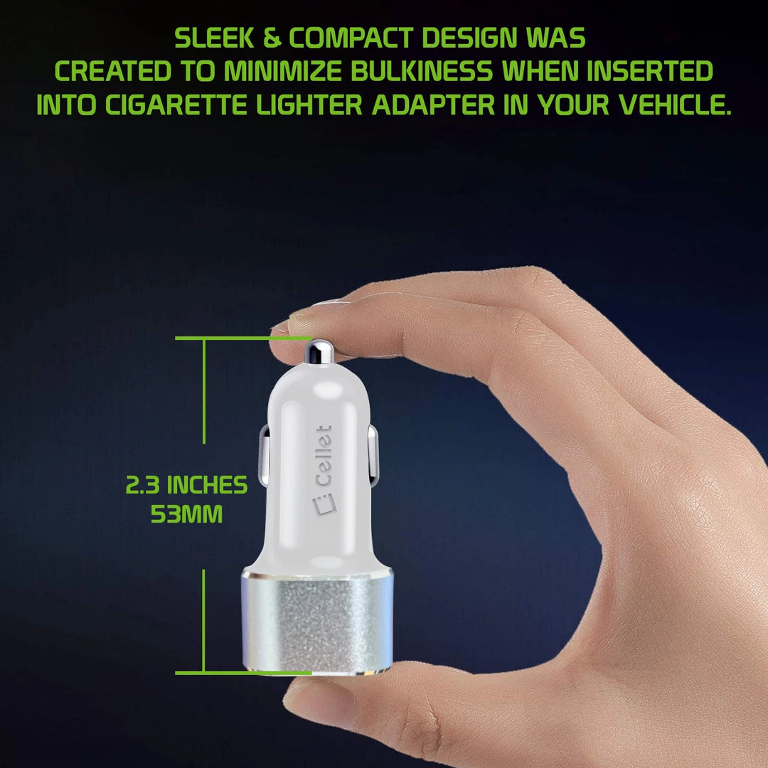 Equipped with two (2) USB ports for maximum compatibility, you can charge two devices simultaneously with the Cellet high-power car charger. Our dual USB charger contains one USB-A port and one USB-C port. You can charge devices such as your iPhone 8/8 Plus, Samsung Galaxy S9/S9 Plus iPhone 7, 7 Plus, iPads, tablets, digital cameras, and more with existing USB cables. Built-in technology protects your device from over-current, overcharging, and overheating. Its sleek and compact design was created to minimize bulkiness when inserted into a cigarette lighter adapter in your vehicle. The convenient compact size allows you to store it easily in your glove compartment or your computer bag.