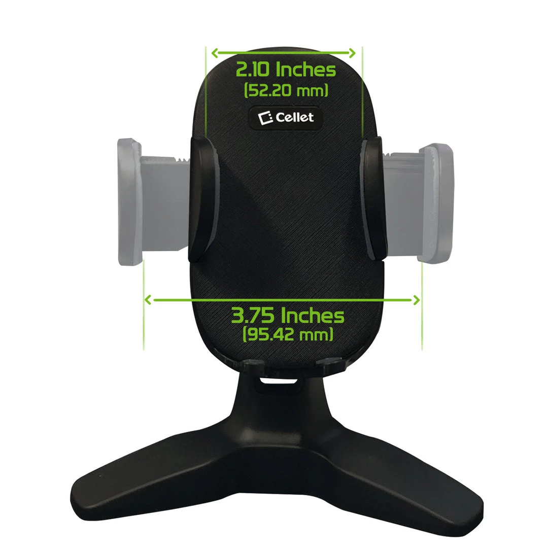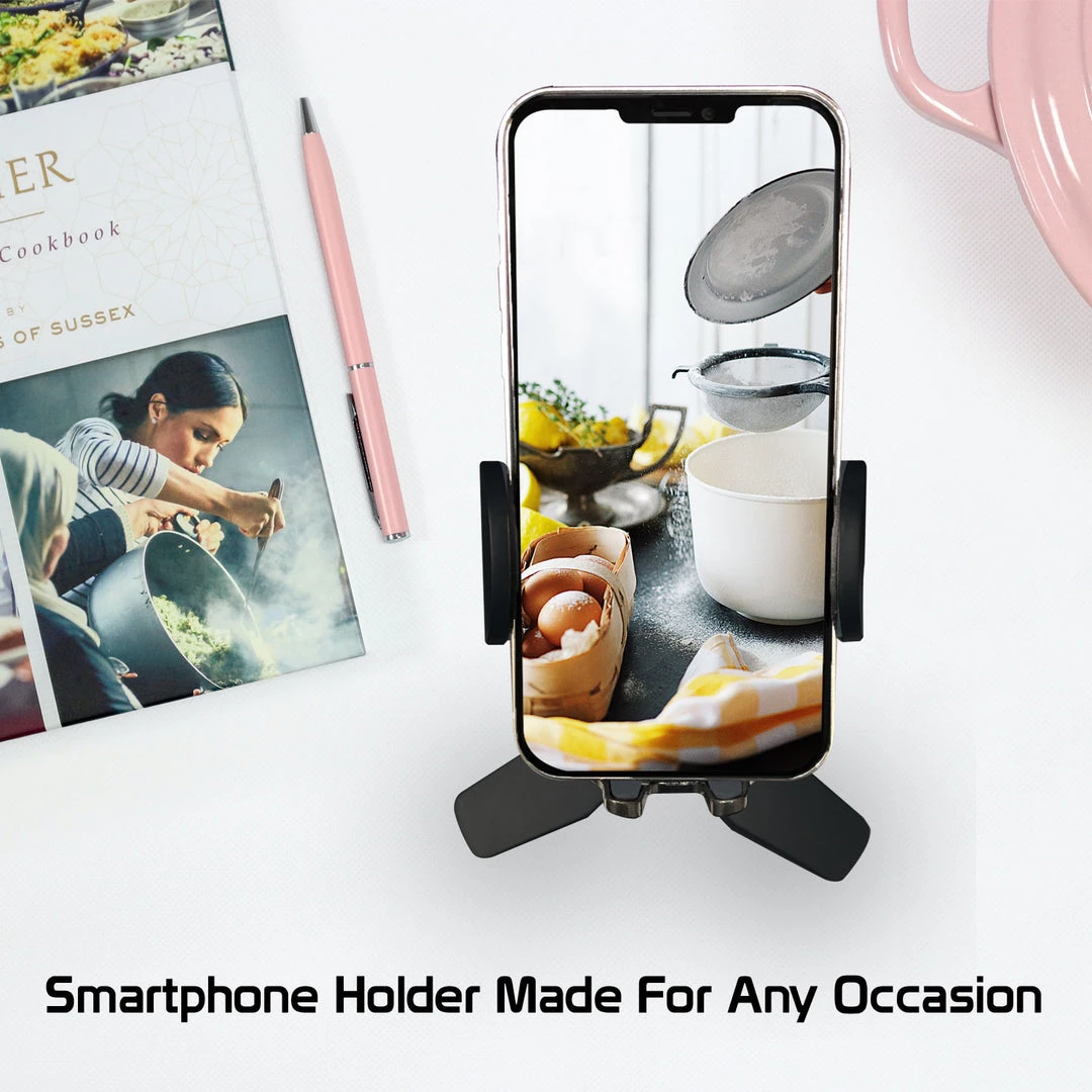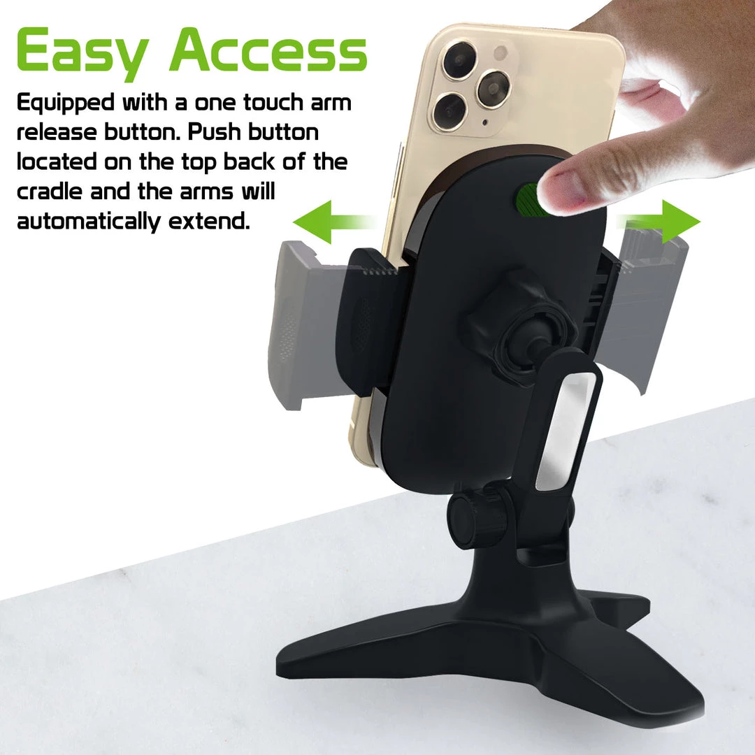 Mount your Smartphone onto your desk or any flat surface at home with the Adjustable Desktop Smartphone Holder. Equipped with anti-slip rubberized and soft holder grips, it ensures a secure hold onto your device. The 360 degree rotation capability allows you to view your device in any desired position. The base is equipped with non-slip rubberized grips to make sure the stand stays in place. An accurate cutout was added for your charging cable to maintain a neat and tangle free environment. To use, simply place the stand onto your desk or any flat surface. Push the one touch arm release button located on the top back of the cradle to extend arms, insert device and push arms closed.