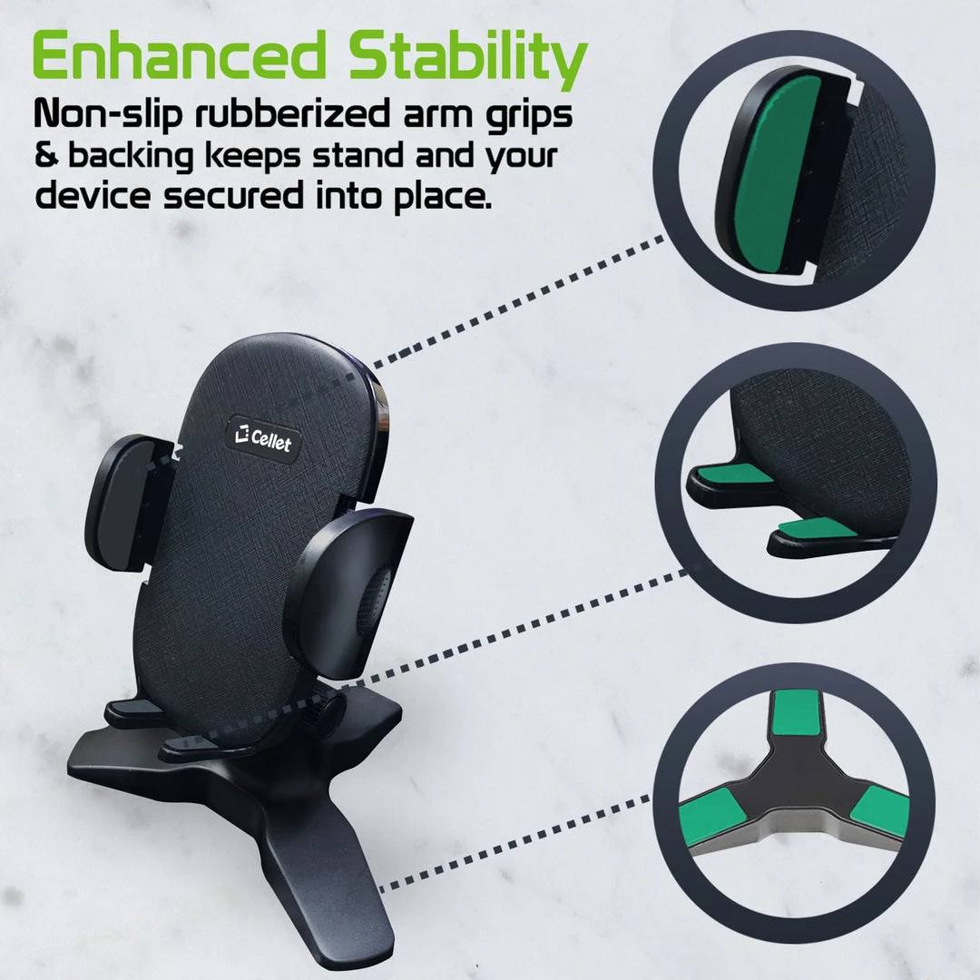 - Non-slip rubberized arm grips and backing keeps stand and your device secured into place.
