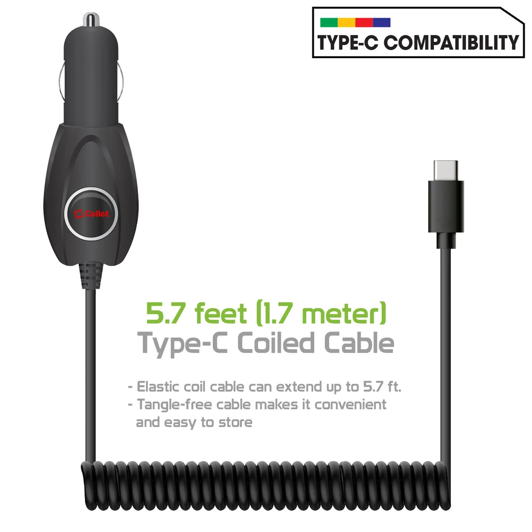 This Type-C Coiled Cable Car Charger provides power to your device to keep you connected when the battery is low. The slim, compact, and lightweight charger minimizes any bulk inside your car and makes it easier to store. The Type-C charger is a convenient solution for charging your device when traveling. Equipped with an attached Type-C USB coiled cable, it allows your device to charge at rapid speeds. The elastic coil cable is tangle-free and can extend up to 5.7 ft. This coiled cable car charger is compatible with any micro USB-enabled device.
