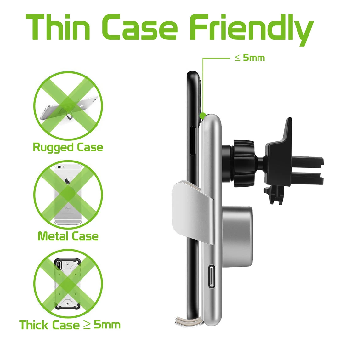 Mount and charge your Apple iPhone XS Max in your vehicle with the Wireless Charging Air Vent Phone Mount. Simply screw the cradle onto the base and attach it to your air vent. Tap the auto touch button located on the bottom of the cradle to have the arms extend automatically. Once your device is placed onto the charging pad, it will begin to charge and the arms will lock on their own. To have your device released, lightly tap the button. The arms contain non-slip rubberized grips that hold your device in place and help prevent any scratches on your device. Cradle is equipped with 360-degree rotation to view your device at any desired angle. The cradle will charge wirelessly, simply place your QI-enabled device onto the charging pad. Please note: your device must be wireless charging enabled or have a wireless charging receiver installed. Wireless charging receiver sold separately.