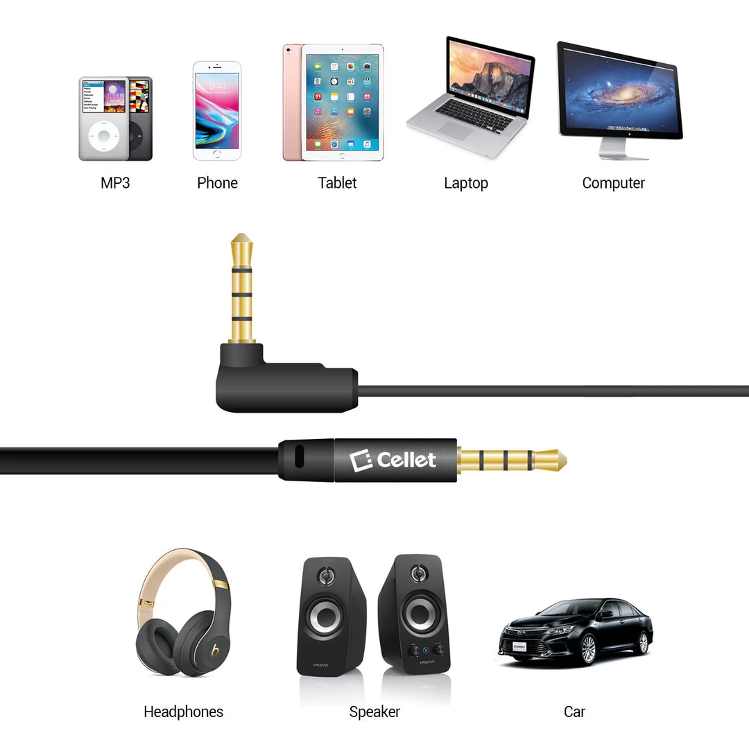 Connect your smartphone, MP3 player or tablet to your home or car stereo system with the Cellet 3.5mm to 3.5mm Auxiliary Audio Cable. This cable supports most devices containing a standard 3.5mm auxiliary jack. The right angle connector and 5 foot long anti-tangle provides easy connectivity and delivers a direct wired connection that is free of static and FM interference.