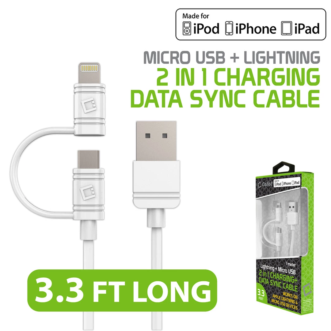 Charge and/or sync your Lightning or micro USB-ready device with the Cellet 2 in 1 USB Cable. Equipped with a micro USB connector with detachable Lightning 8 pin connector, you can either charge or sync your 8 Pin compatible device simply by putting the Lightning connector on top of the micro USB connector or removing the Lightning connector, exposing the micro USB connector. The Lightning 8 Pin connector is Apple Licensed (MFI Certified), therefore it was created to meet Apple¡¯s strict manufacturers¡¯ standards and specifications and will not damage your device. Both slim connectors will fit most premium cases and the 2 in 1 cable can be plugged into any computer or USB adapter.