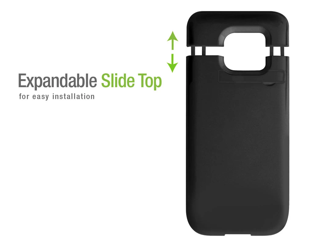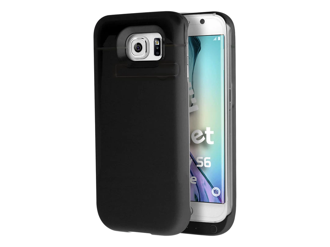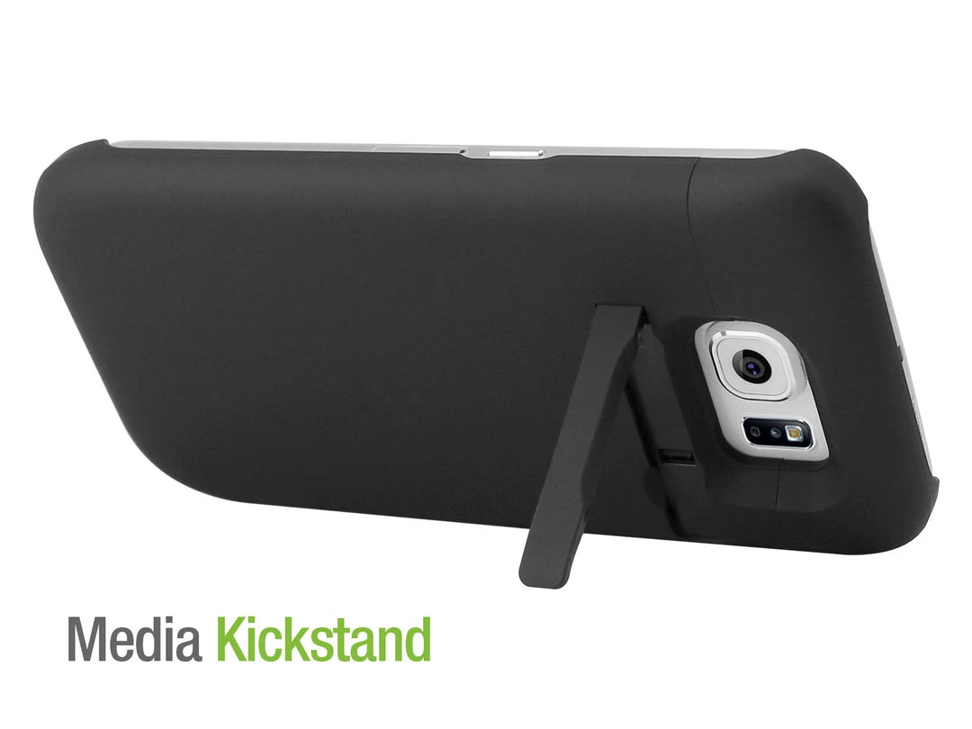 Equipped with 3200mAh high power capacity, this extended battery case combines functionality by providing protection for your Samsung Galaxy S6 edge and doubling battery life. The lightweight, slim profile case features 4 blue LED light power indicators that show the battery case power life and can be charged with a micro USB cable connected to a wall adapter or computer. Features include an extendable slide top for easy installation and a built-in media kickstand for viewing movies.
