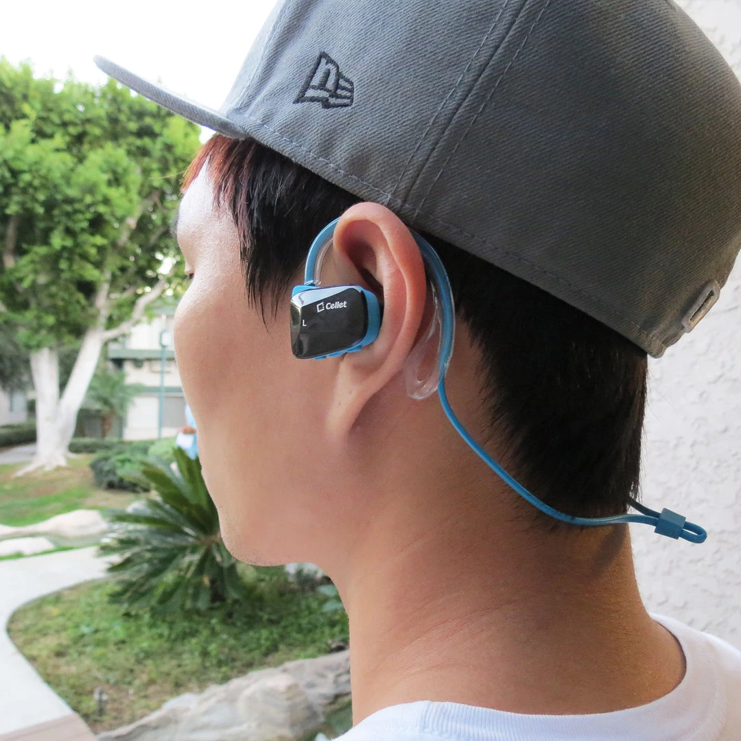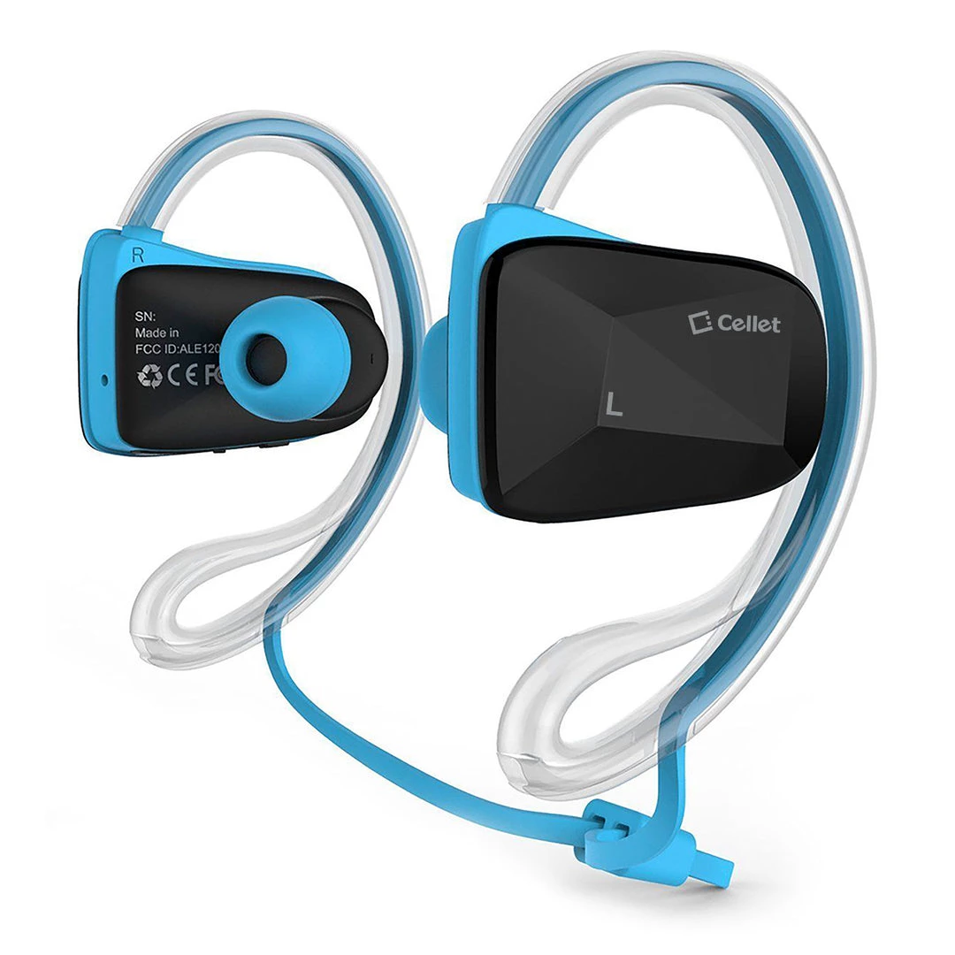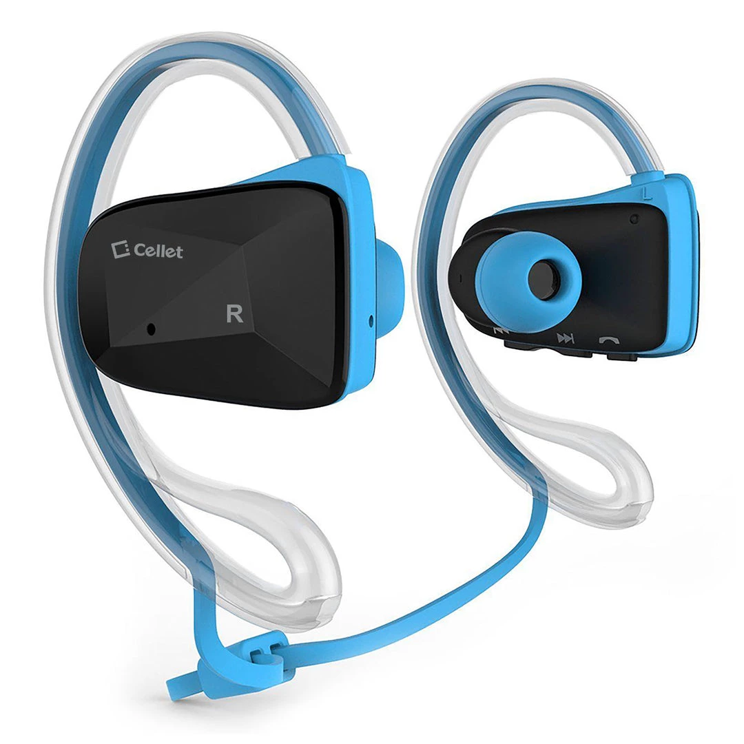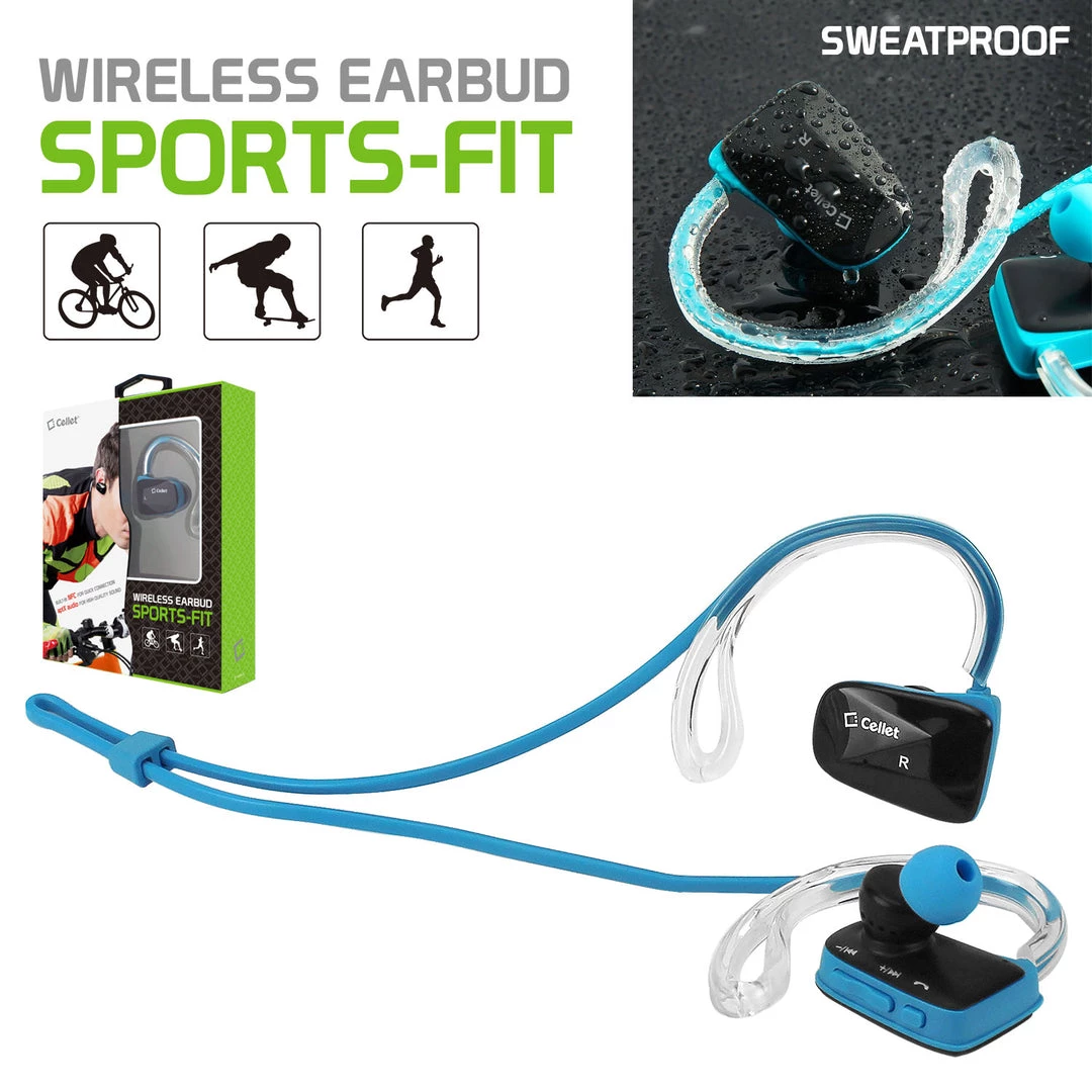 Work out intensively while listening to clear-sounding music comfortably with the Cellet Sports-Fit Wireless Headset. Equipped with Wireless Version V4.1 technology, it provides a more stable connection, less power consumption, and multipoint functionality (connect 2 phones at the same time) NFC connectivity lets you pair it with your phone instantly. Noise-isolating earbuds deliver high-quality sound and dual microphones have noise cancellation features that deliver clear communication between you and your caller. Internal rechargeable Li-ion battery offers up to 6 hours of talk time and up to 5 hours of music playback time. Sweatproof, this set was designed to withstand the most rigorous workouts and the ergonomically angled shape ensures a secure fit as you exercise. Included in the package are a micro USB cable for charging purposes, 3 different sizes of earbud tips (small, medium, large,) ear hooks (small and large), and a user manual.