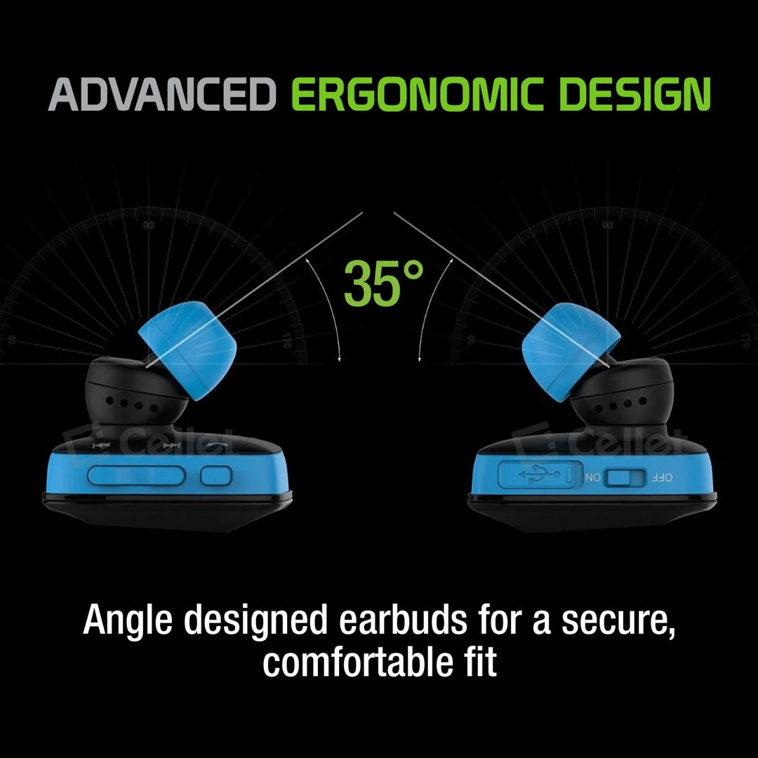 - Ergonomically angled designed earbuds for a secure, comfortable fit