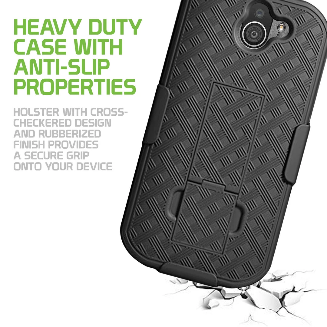 Combining protection with functionality, this shell plus holster case allows you to carry your device with ease while providing maximum all-around protection. Built-in media kickstand allows viewing in landscape (horizontal) or portrait (vertical) orientation. The case easily slips into the heavy-duty holster, so you can carry your phone either face up or face down. In addition, the belt clip includes 180-degree rotation capability so you can position the holster at any desired angle. The holster and hard shell combo case comes in all black and contains TPU, rubberized soft coating, which aids as an extra step of precaution against accidental cosmetic damage. Look no further! The slim profile and the multi-functionality of this product merge style, versatility, and supreme protection.
