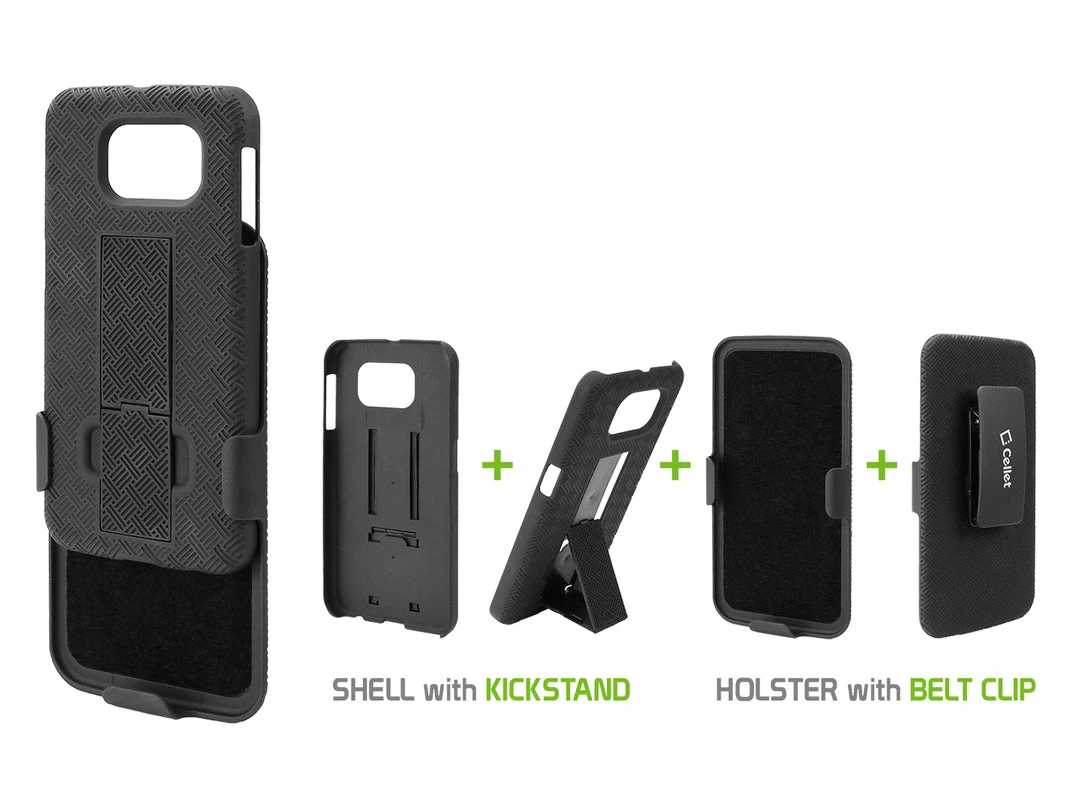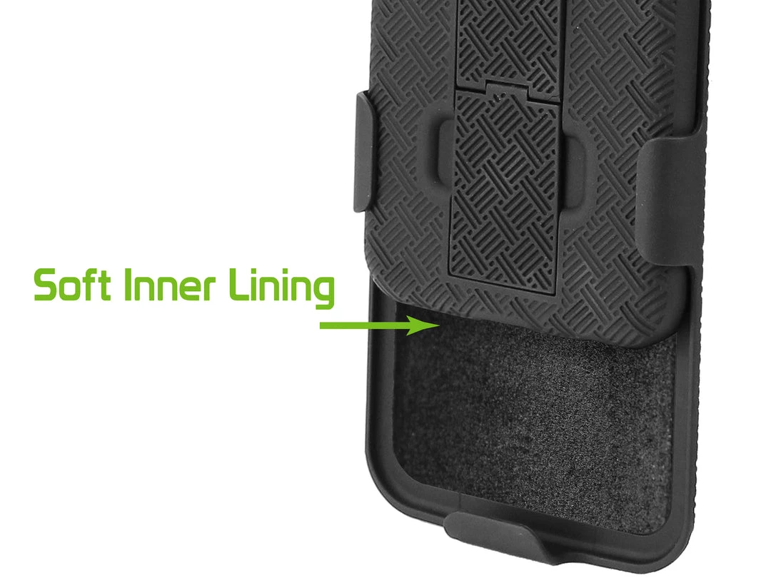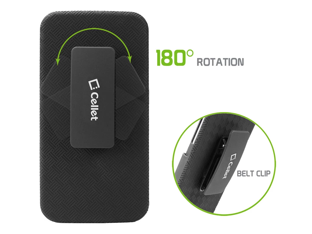 Combining protection with functionality, this shell plus holster case lets you carry your device with ease while providing maximum all-around protection. Built-in media kickstand on the holster and shell allows viewing in landscape (horizontal) or portrait (vertical) orientation and the heavy-duty clip has 180-degree rotation. Rubberized finish and cross-checkered design act as an extra precautionary step against accidental cosmetic damage. The slim profile and the multi-functionality of this product merge style, versatility, and superior protection.