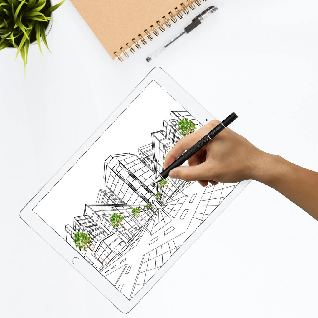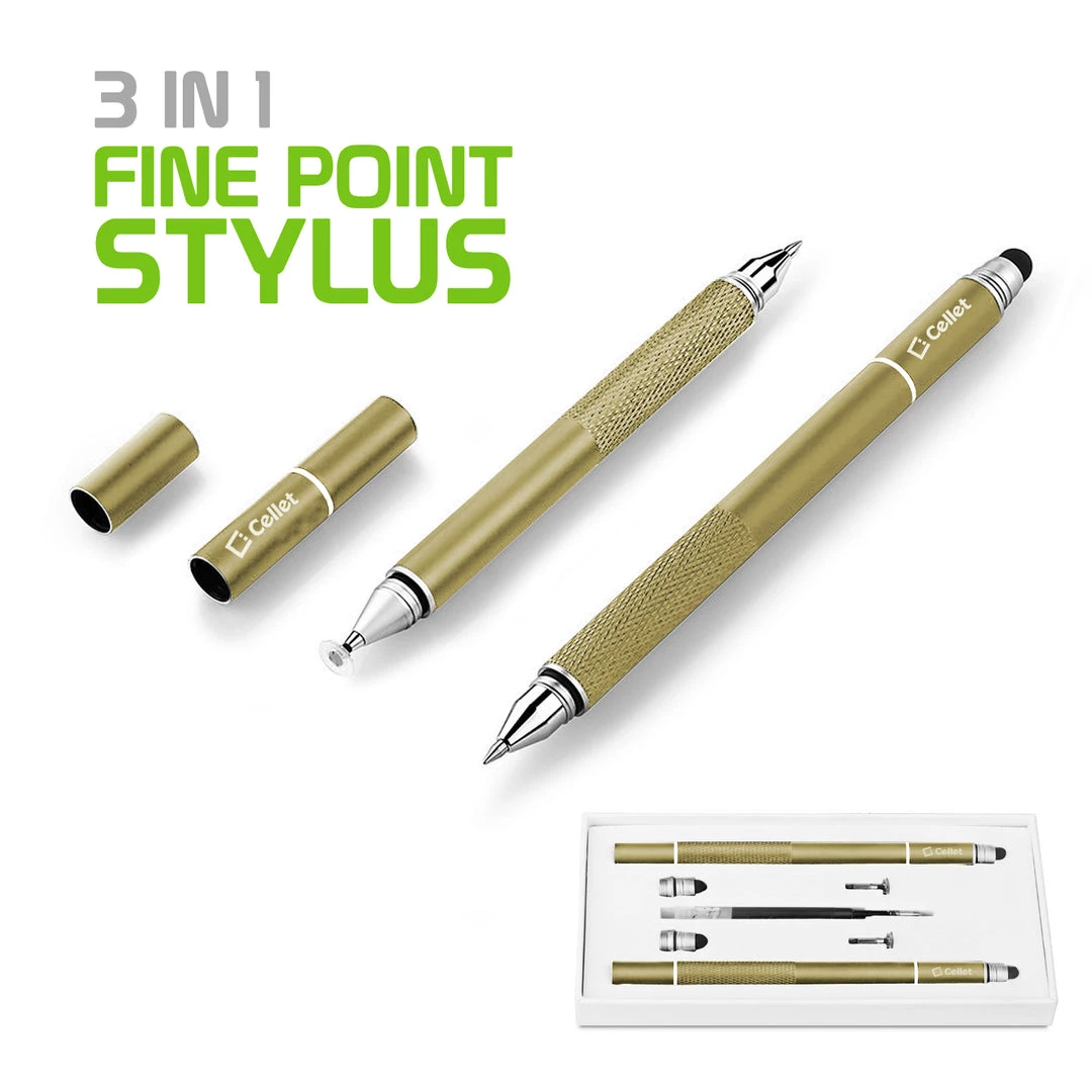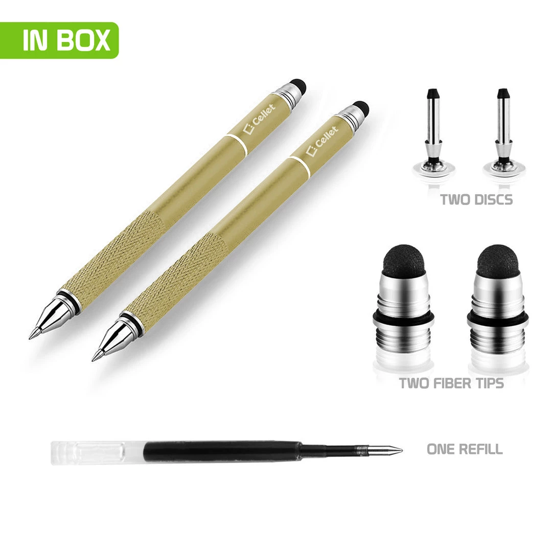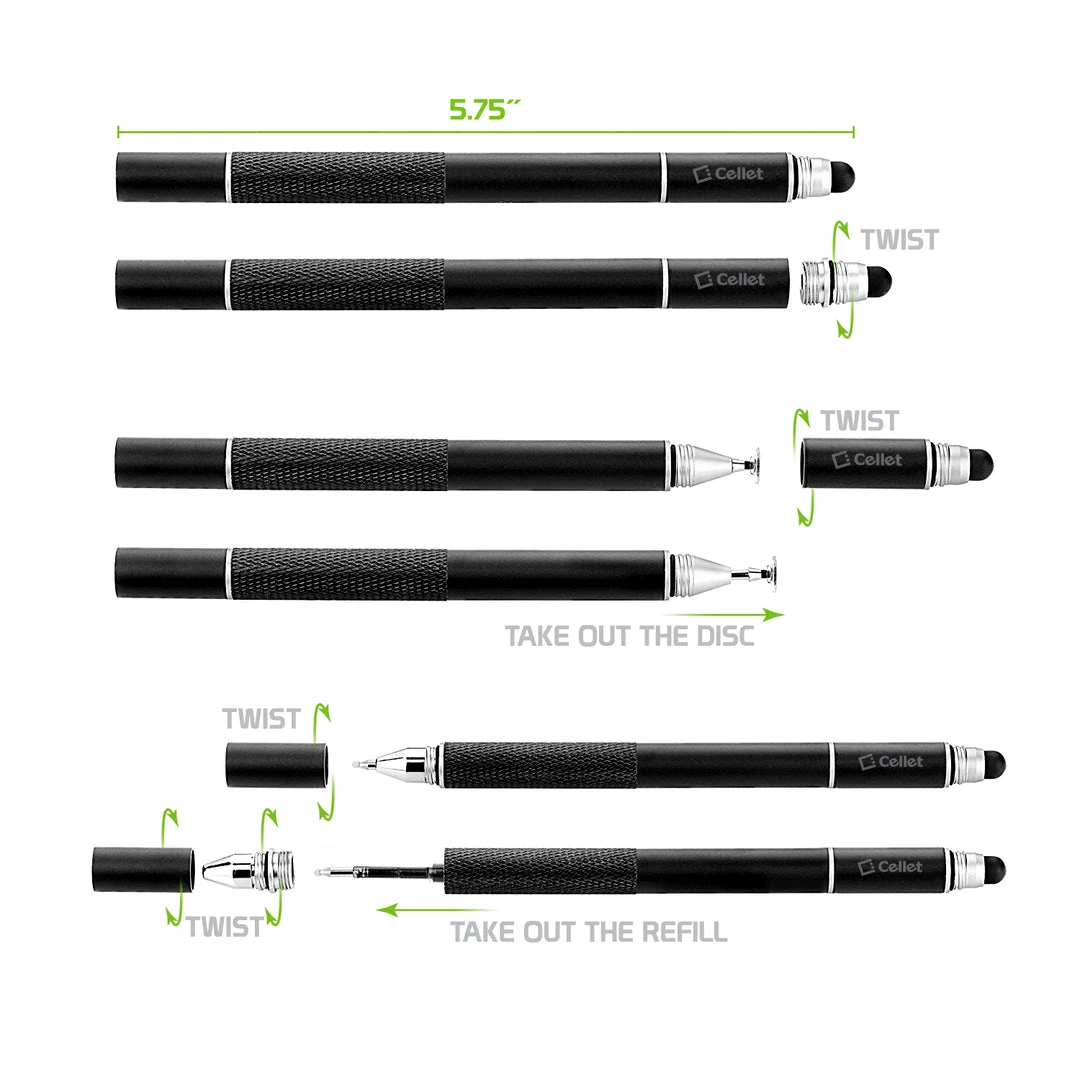 Use the 3 in 1 stylus pen by Cellet when drawing or taking notes on your iPad, tablet, or smartphone. The 3 in 1 stylus pen is equipped with a ballpoint ink pen, precision disk stylus, and a captive stylus pen. To use the precision clear disk stylus or ballpoint pen simply twist the ends to the right. This set comes with 2 stylus pens, 2 clear disk replacements, 2 fiber tip replacements, and 1 ink refill. The use of the stylus is universal, it can be used on smartphones, tablets and touch screen enabled laptops.Â