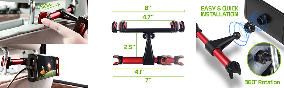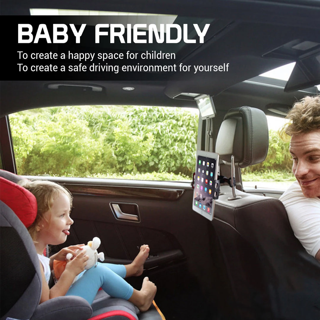Keep your passengers entertained as your drive with the universal back seat headrest tablet/phone mount holder. This mount was designed to hold your device steady while watching videos as you drive. The back seat headrest mount holder is extremely convenient for long drives. The back seat headrest mount holder provides a 360 degree rotation, which allows you to view your tablet or smartphone in landscape or portrait view. The holder is equipped with soft holder grips to protect your device from any scratches.