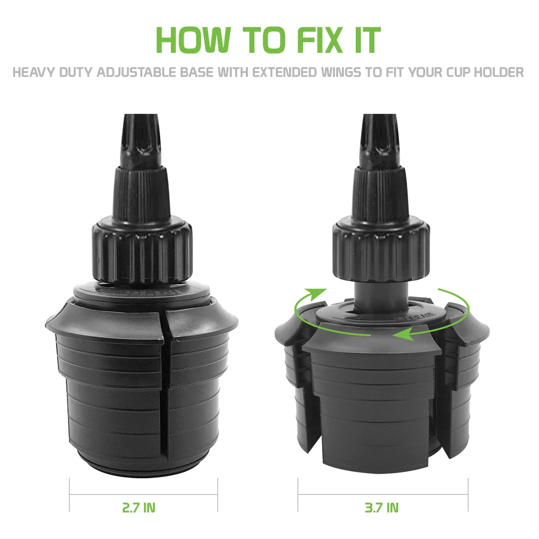 - Heavy-duty adjustable base with extended wings to fit your cup holder