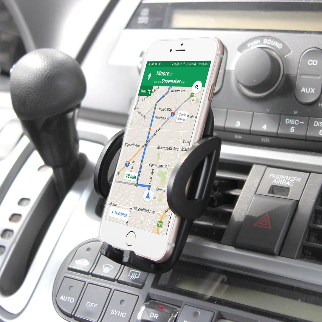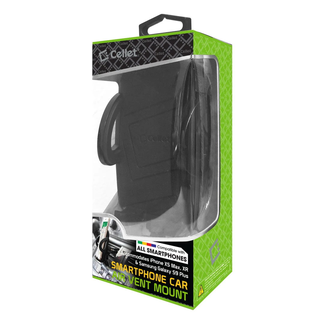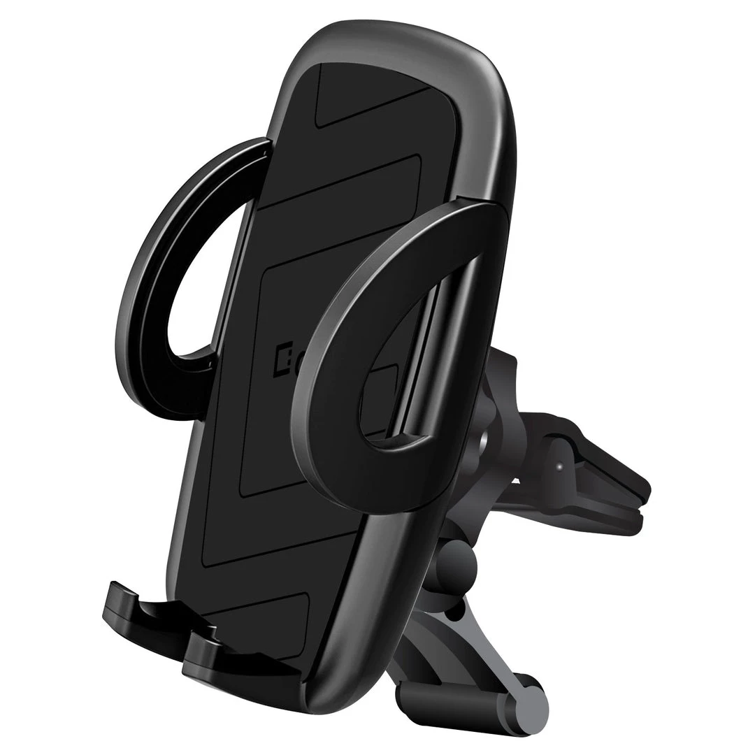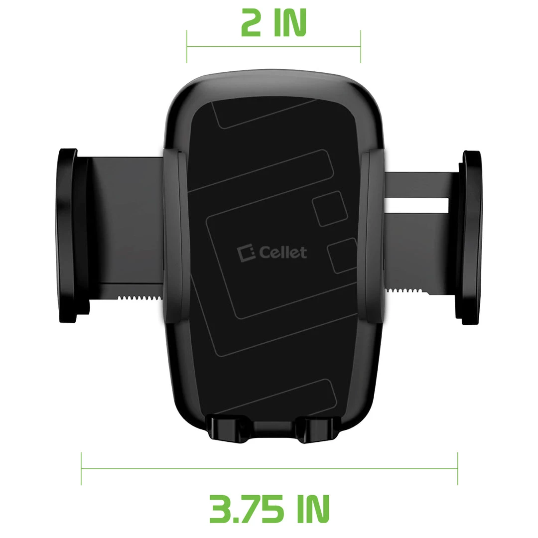 Securely mount your smartphone vertical or horizontal with the Cellet Smartphone Air Vent Car Mount. This phone holder will firmly fasten into your car air vent and hold your phone with ease featuring a spring tab and sturdy lower legs for added support onto your smartphone. Cellet Smartphone Air Vent Car Mount offers one-touch extendable side arms that accommodate phones up to 3.5 inches in width. Turn knob lock created for stability. Position smartphone in any desired angle. Rubberized padded protective grips and backing ensure a firm and secure grip on your device and the holder provides 360 rotation capability.Â