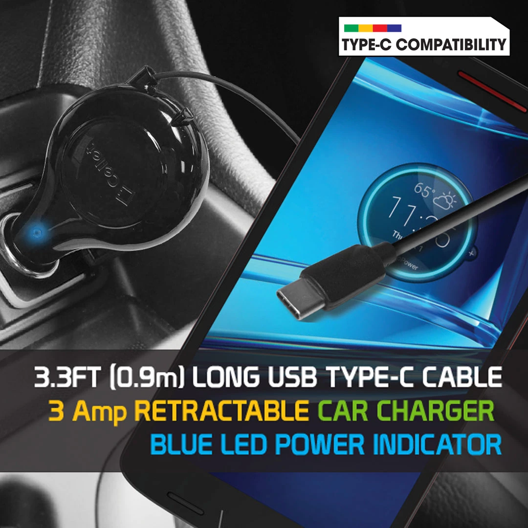 Equipped with 15 watts/3 amps output, this reversible Type-C car charger can charge your Nexus 6P or Samsung Galaxy Note 7 at its maximum rate. Our chargers are built with advanced power smart detection that identifies the device¡¯s max charging speed and smart IC chip technology that provides overcharge, overheat, and over-current protection. Featuring an ergonomic design and an innovative one-touch retractable button, the 3 ft cord rapidly retracts for easy storage without any tangles.