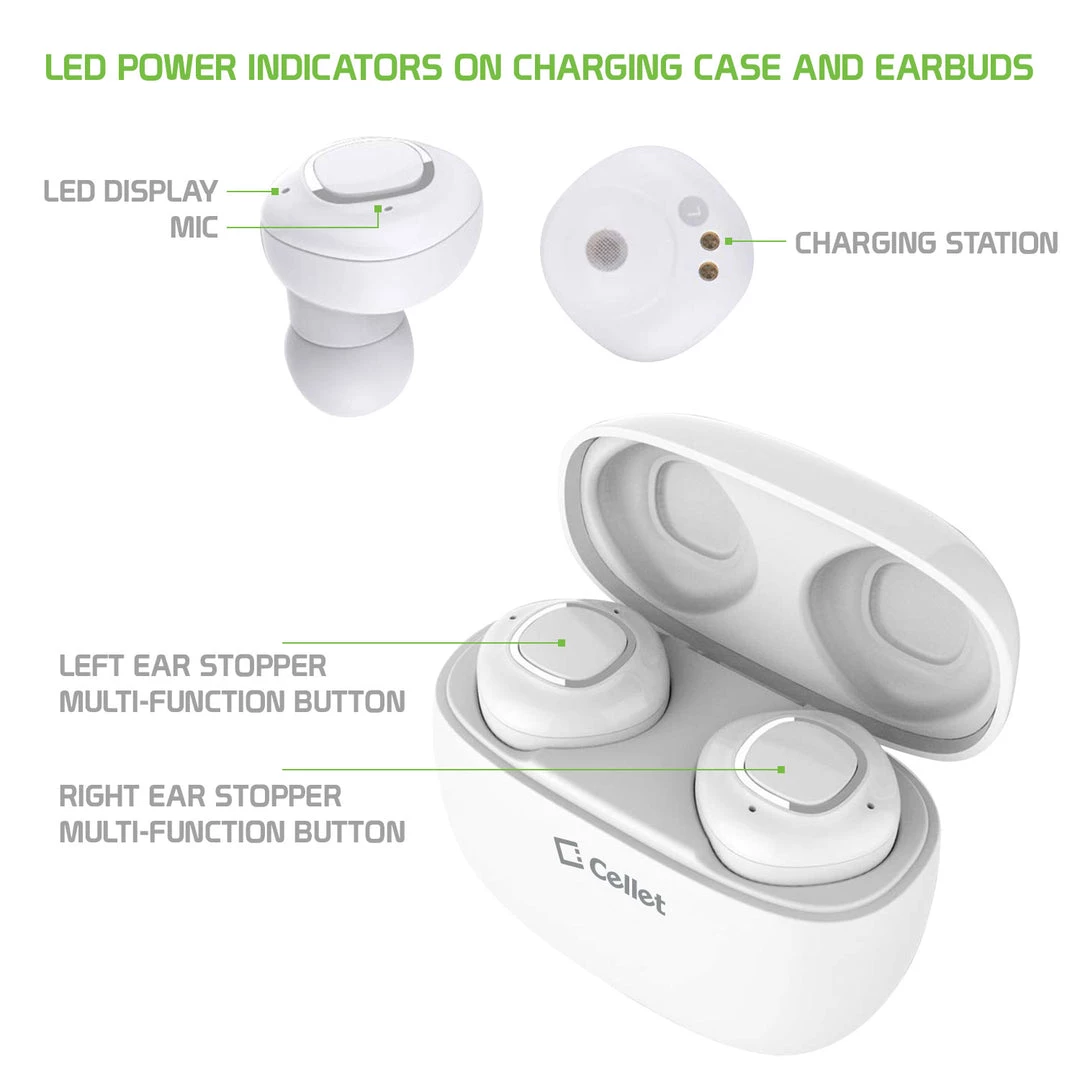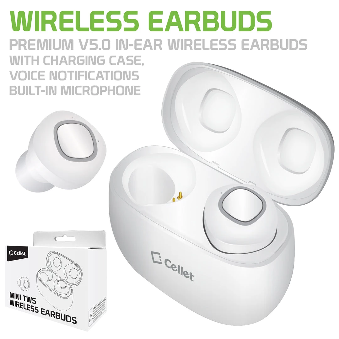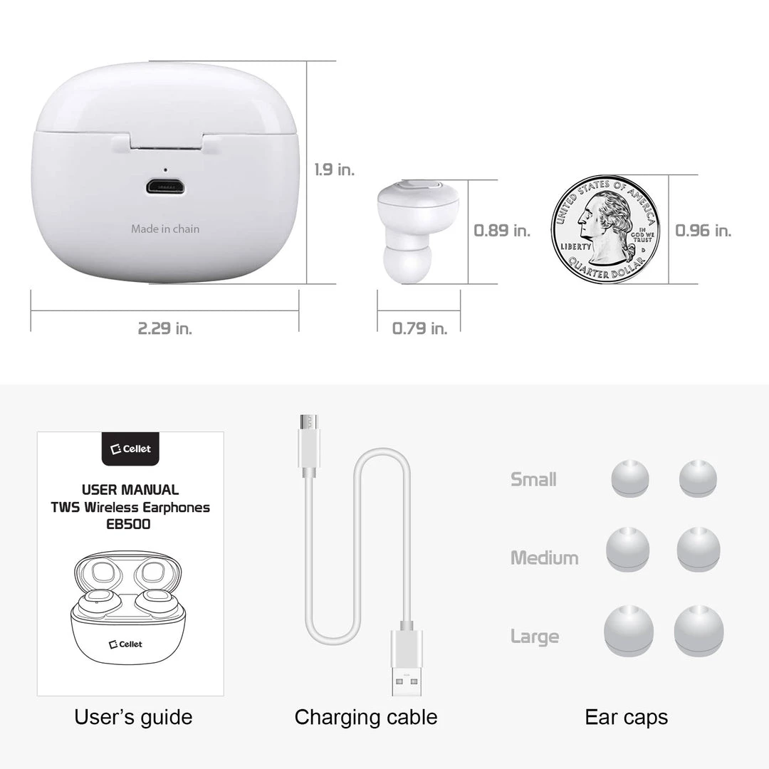Enjoy your day while listening to clear sounding music comfortably with the Premium Wireless Earbuds. Equipped with Wireless Version V5.0 technology, it provides a more stable connection and less power consumption. Noise-isolating earbuds deliver high-quality sound and built-in dual microphones deliver clear communication between you and your caller. Voice notifications inform you when there is an incoming call, battery level, and earbuds are paired to your device. A multi-functional button on both earbuds allows you to pause music, answer/reject/hang up a call, and activate voice notifications. Internal rechargeable Lithium Polymer battery offers up to 4 hours of talk time, 4 to 6 hours of music, and 150 hours of standby time. Included in the package are charging/storage case, a micro USB cable for charging purposes, 2 different sizes of earbud tips (small and large,) and a user manual.Â