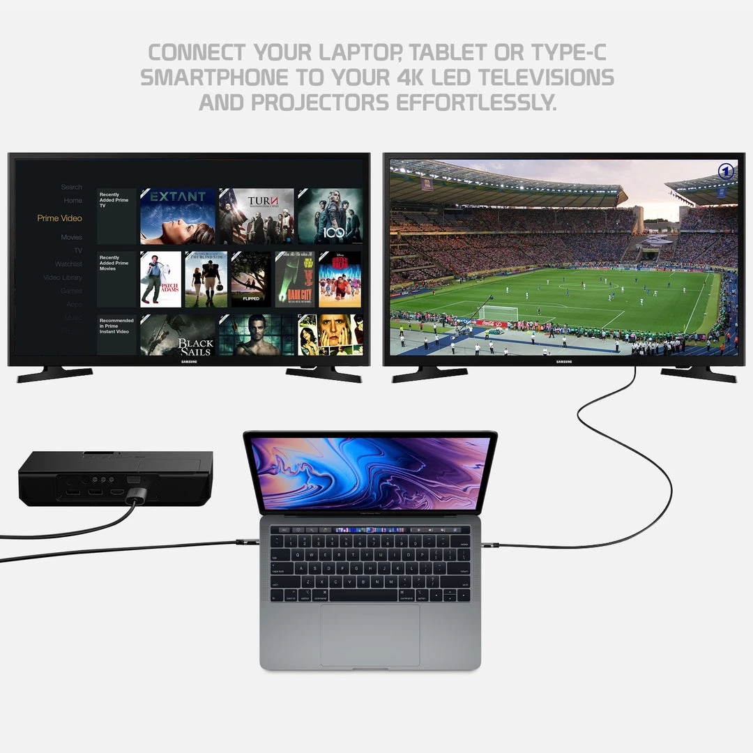 - Connects a USB-C enabled device to an HDTV, 4K LED TV, monitor, or projector with HDMI input.