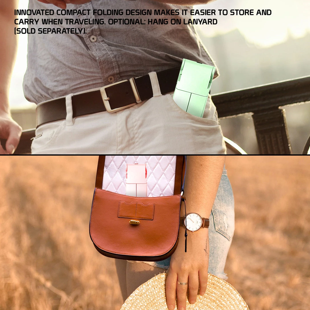 Keep cool as you travel, go camping or attend a concert during a hot summer day with the Cellet dual-head personal cooling mini fan. Small but efficient when operating, the fan makes minimal noise making it easy to use anywhere, even indoors. This rechargeable mini fan is extremely useful when participating in any outdoor activities or on a daily basis. Its innovative folding design makes it easy to store and carry when traveling. The mini fan is also equipped with a lanyard hole, if used, hang the mini fan from your neck and keep your hands free. To begin using, simply press the power button once for low speed and twice for high speed. The hands-free personal mini fan also allows you to keep cool without the hassle of having your hands occupied. Simply place the fan onto a flat surface. To keep a fan in place, adjust the angle or place an object on the base.