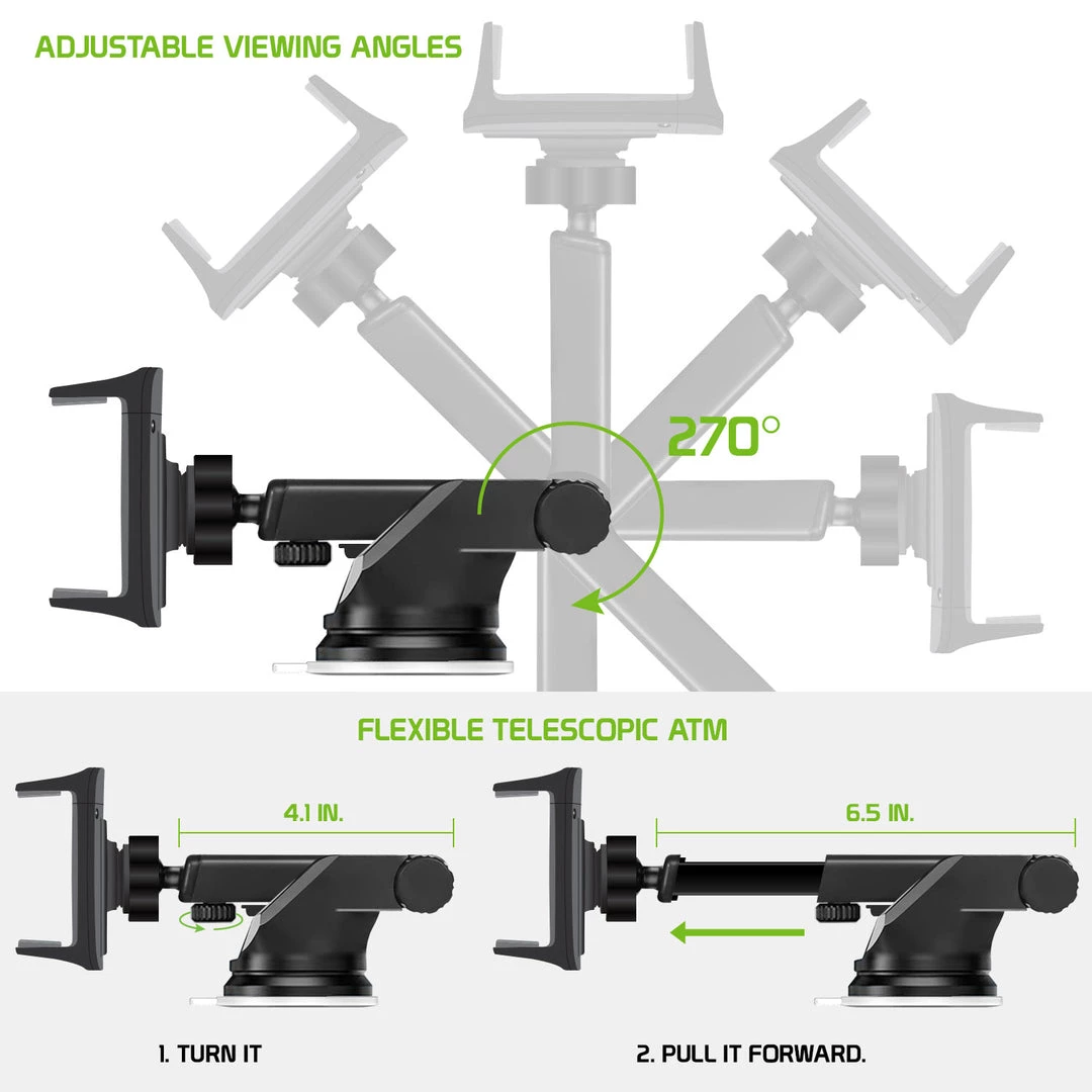 - Folding and extendable arm can be adjusted to length and can fold to any 270-degree angle. Cradle has a 360-degree rotation capability that allows you to view your device in any desired position.