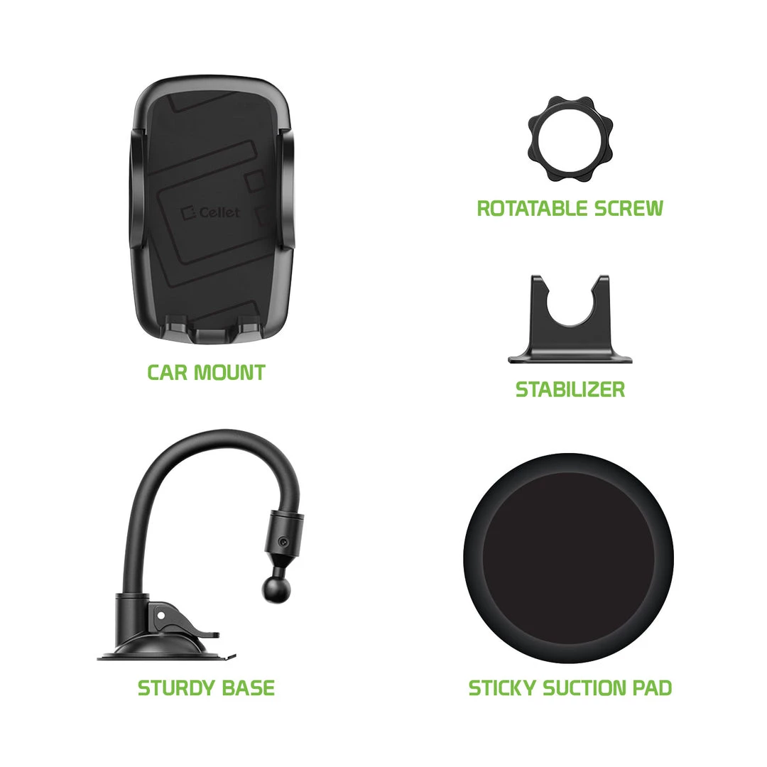 - Suction cup has a lock lever on the base to secure onto your dashboard or windshield. Also comes with a reusable sticky suction cup to relocate the mount. To reuse, simply rinse a sticky suction pad with warm water and let air dry.