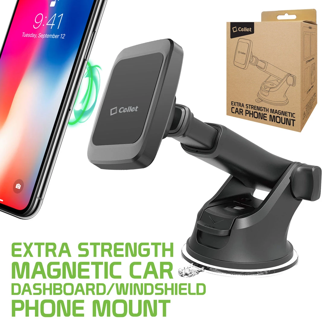 Mount your Smartphone in your car or onto your desk at home with the Dashboard/Windshield Holder Mount. Featuring an extra-strength magnet holder, simply hover your device around the holder and it will attach instantly. The attached suction cup and lock lever allow you to mount your phone easily and securely onto any flat surface. The sticky suction cup is reusable (just rinse with water and let air dry) and allows you to easily attach and detach from any surface. Included in the package are two protective films and two rectangle magnets, one with adhesive backing and one without.