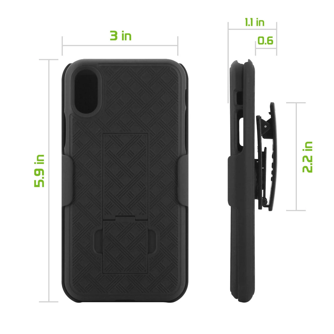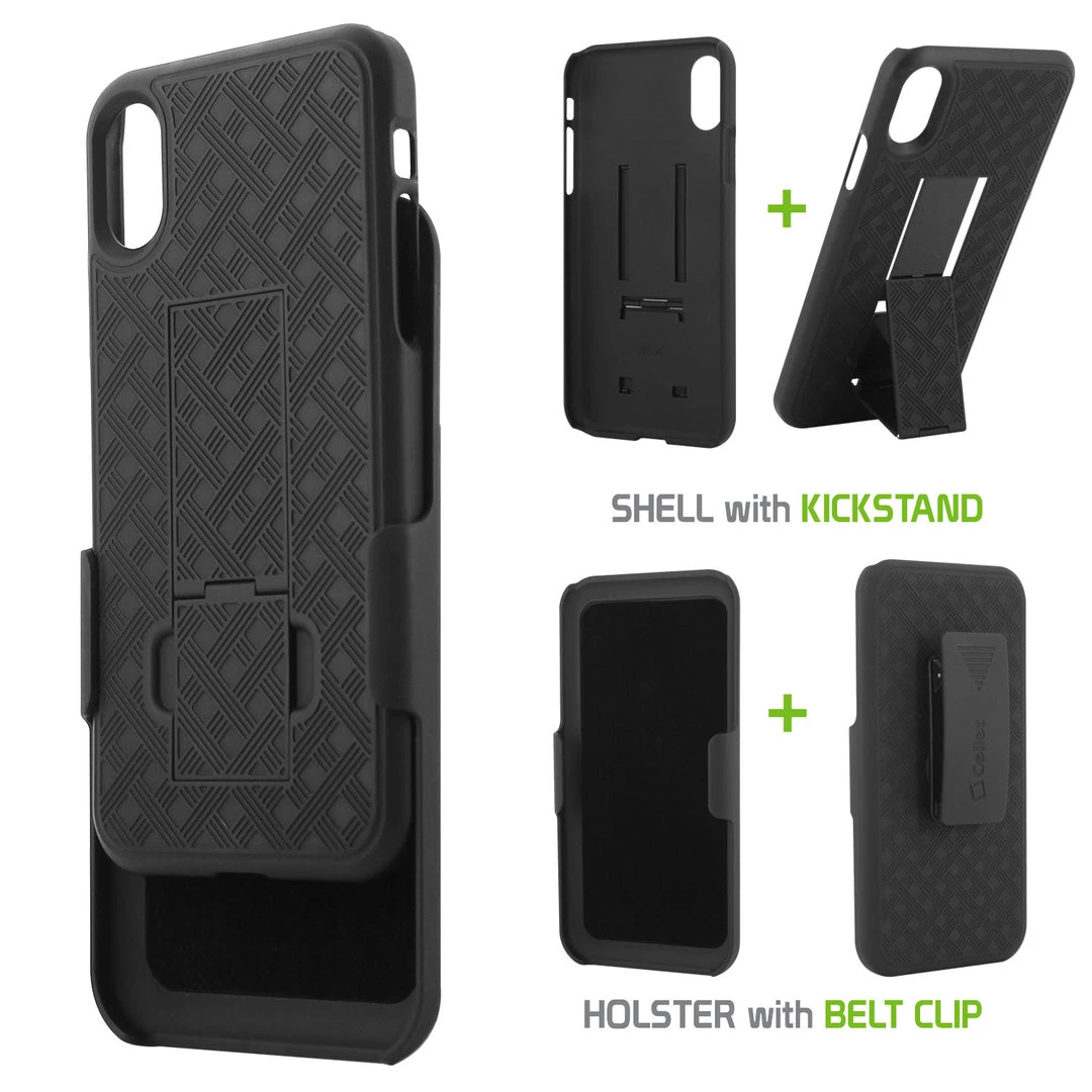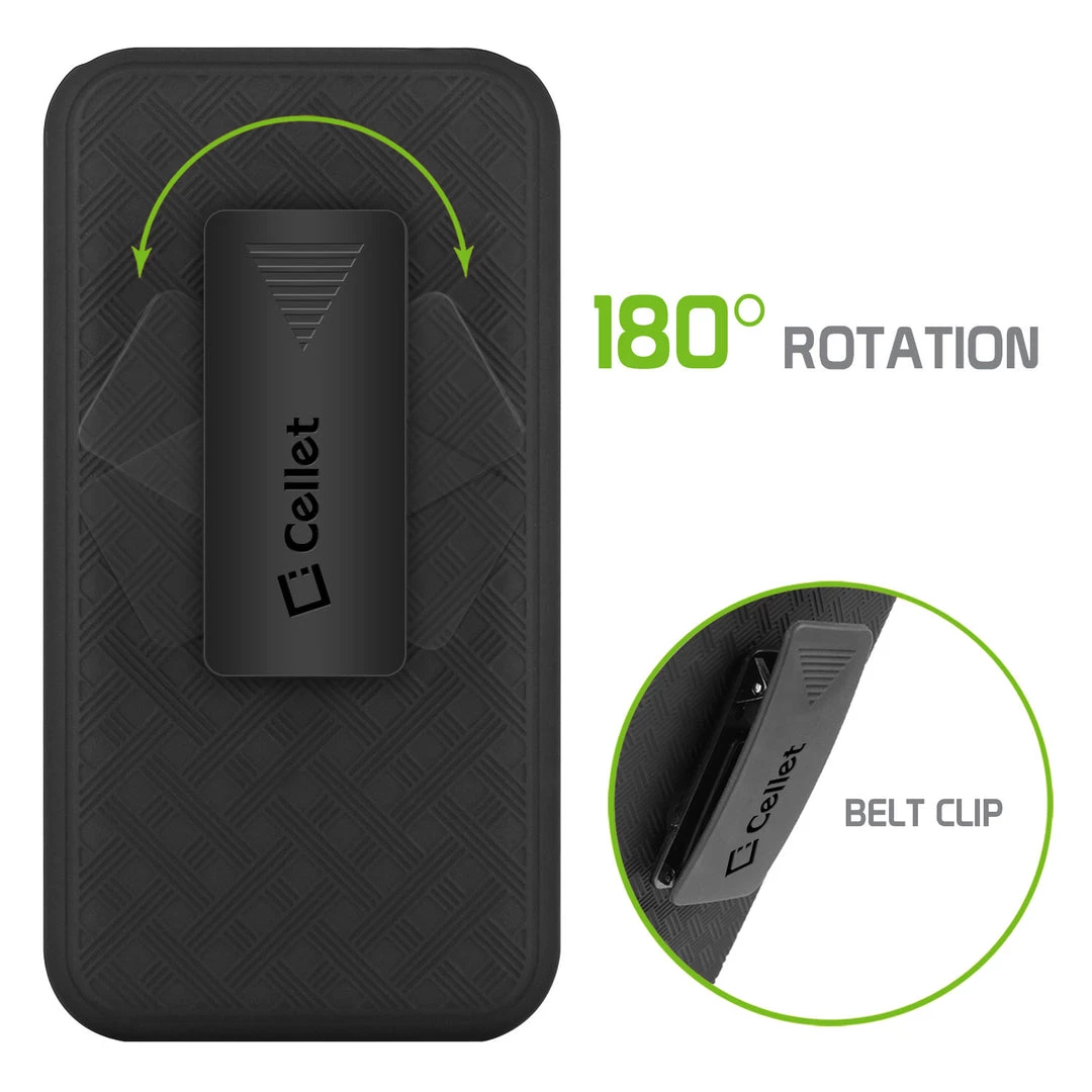 Combining protection with functionality, this shell plus holster case allows you to carry your device with ease while providing maximum all-around protection. Built-in media kickstand allows viewing in landscape (horizontal) or portrait (vertical) orientation. The case easily slips into the heavy-duty holster, so you can carry your phone either face up or face down. In addition, the belt clip includes 180-degree rotation capability so you can position the holster at any desired angle. The holster and hard shell combo case comes in all black and contains TPU, rubberized soft coating, which aids as an extra step of precaution against accidental cosmetic damage. Look no further! The slim profile and the multi-functionality of this product merge style, versatility, and supreme protection.