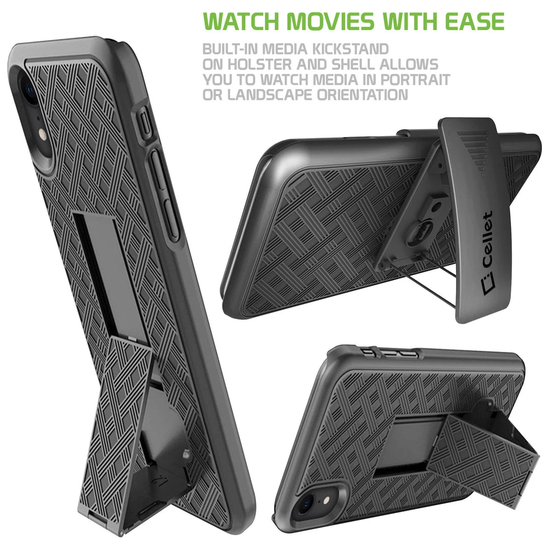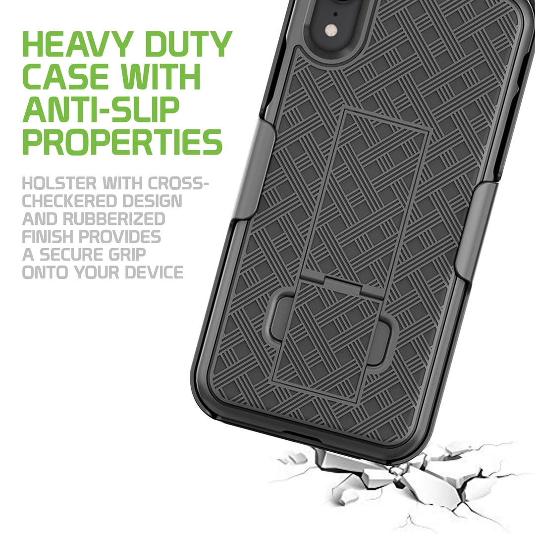 Combining protection with functionality, this shell plus holster case allows you to carry your device with ease while providing maximum all-around protection. Built-in media kickstand allows viewing in landscape (horizontal) or portrait (vertical) orientation. The case easily slips into the heavy-duty holster, so you can carry your phone either face up or face down. In addition, the belt clip includes 180-degree rotation capability so you can position the holster at any desired angle. The holster and hard shell combo case comes in all black and contains TPU, rubberized soft coating, which aids as an extra step of precaution against accidental cosmetic damage. Look no further! The slim profile and the multi-functionality of this product merge style, versatility, and supreme protection.