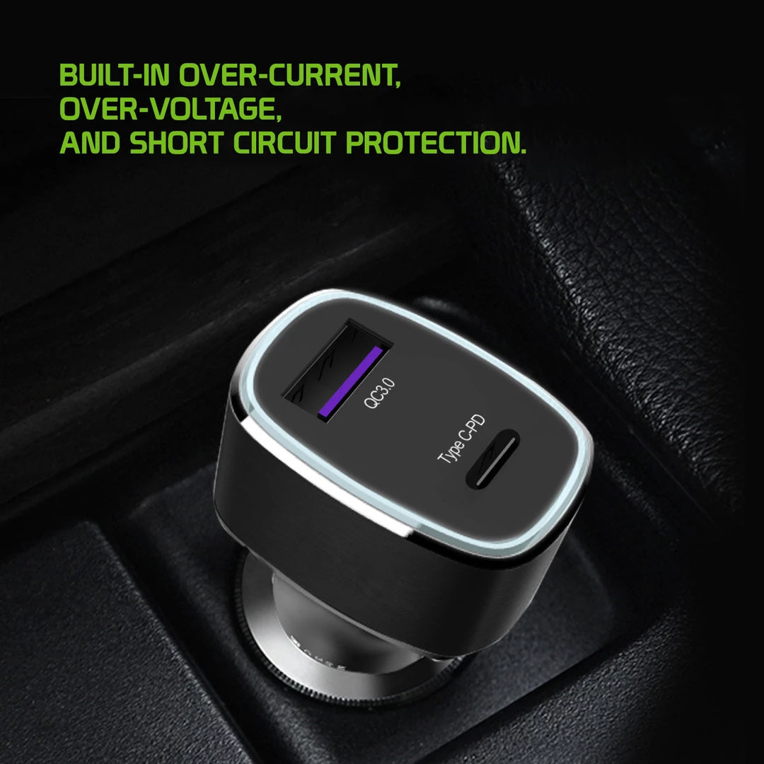 Equipped with two (2) USB ports for maximum compatibility, you can charge two devices simultaneously with the Cellet high-power car charger. Our dual USB charger contains one USB-A port and one USB-C port. You can charge devices such as your iPhone 13 Pro Max, Samsung Galaxy S21 Ultra, iPads, tablets, digital cameras, and more with existing USB cables. Built-in technology protects your device from over-current, overcharging, and overheating. Its sleek and compact design was created to minimize bulkiness when inserted into a cigarette lighter adapter in your vehicle. The convenient compact size allows you to store it easily in your glove compartment or your computer bag.