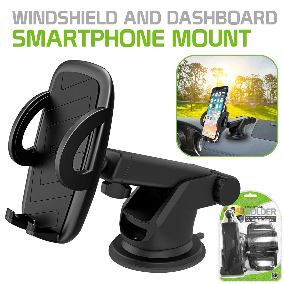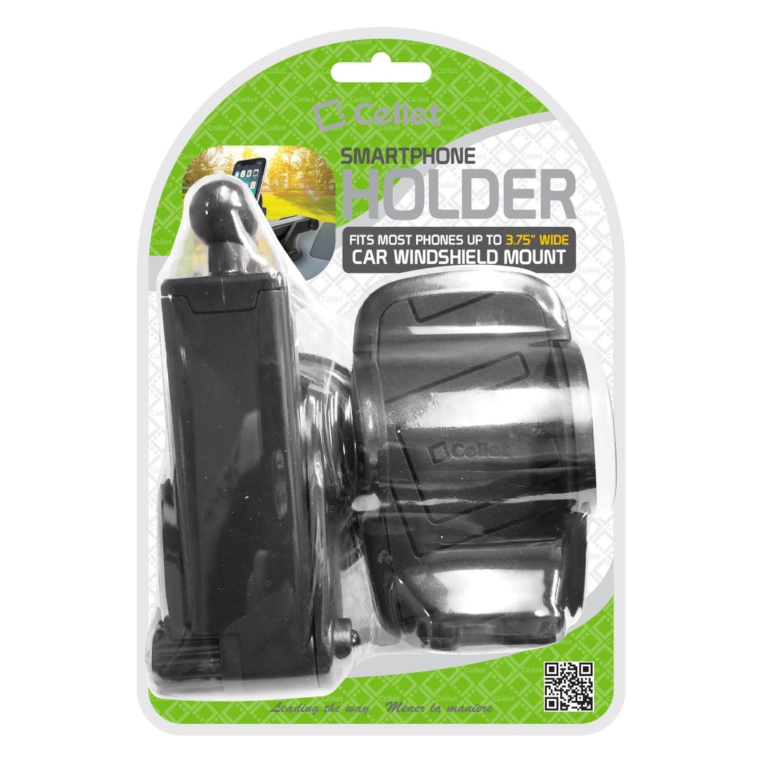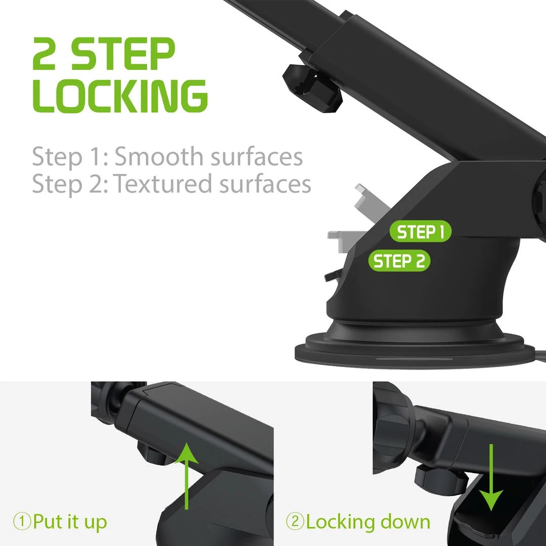 Mount your phone and drive with confidence with our Cellet Universal Windshield and Dashboard Car Smartphone Holder. Equipped 360 degree rotation, you can position your device in any desired angle. The extendable telescopic arm provides a stable foundation for the holder and the sticky suction cup/release lock system ensures a firm position onto your windshield or dashboard. The lock lever with 2 modes allows you to secure the mount onto smooth or textured surfaces. The sticky suction cup is reusable (just rinse with water and let air dry) and allows you to easily attach and detach from any surface.