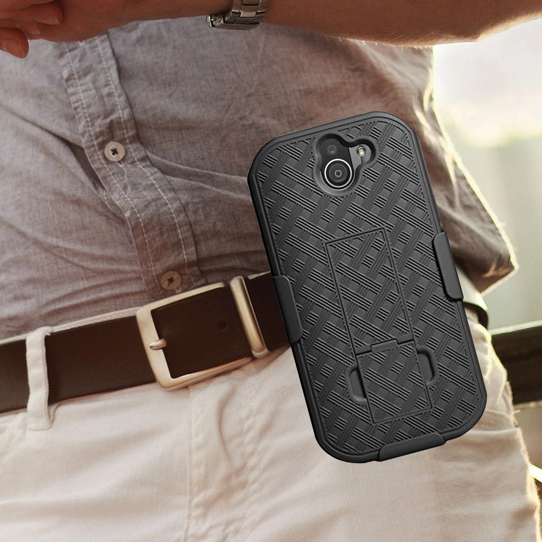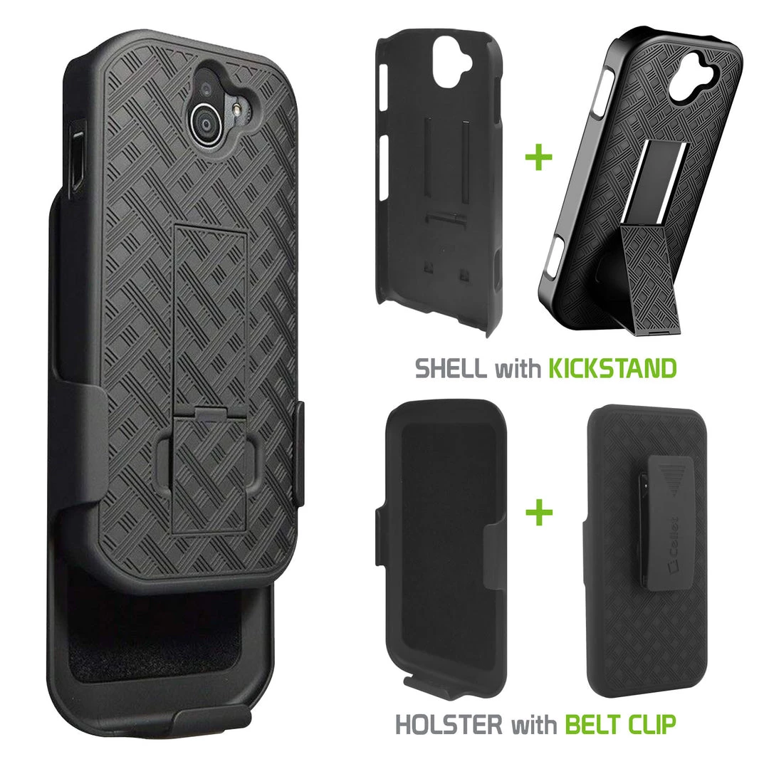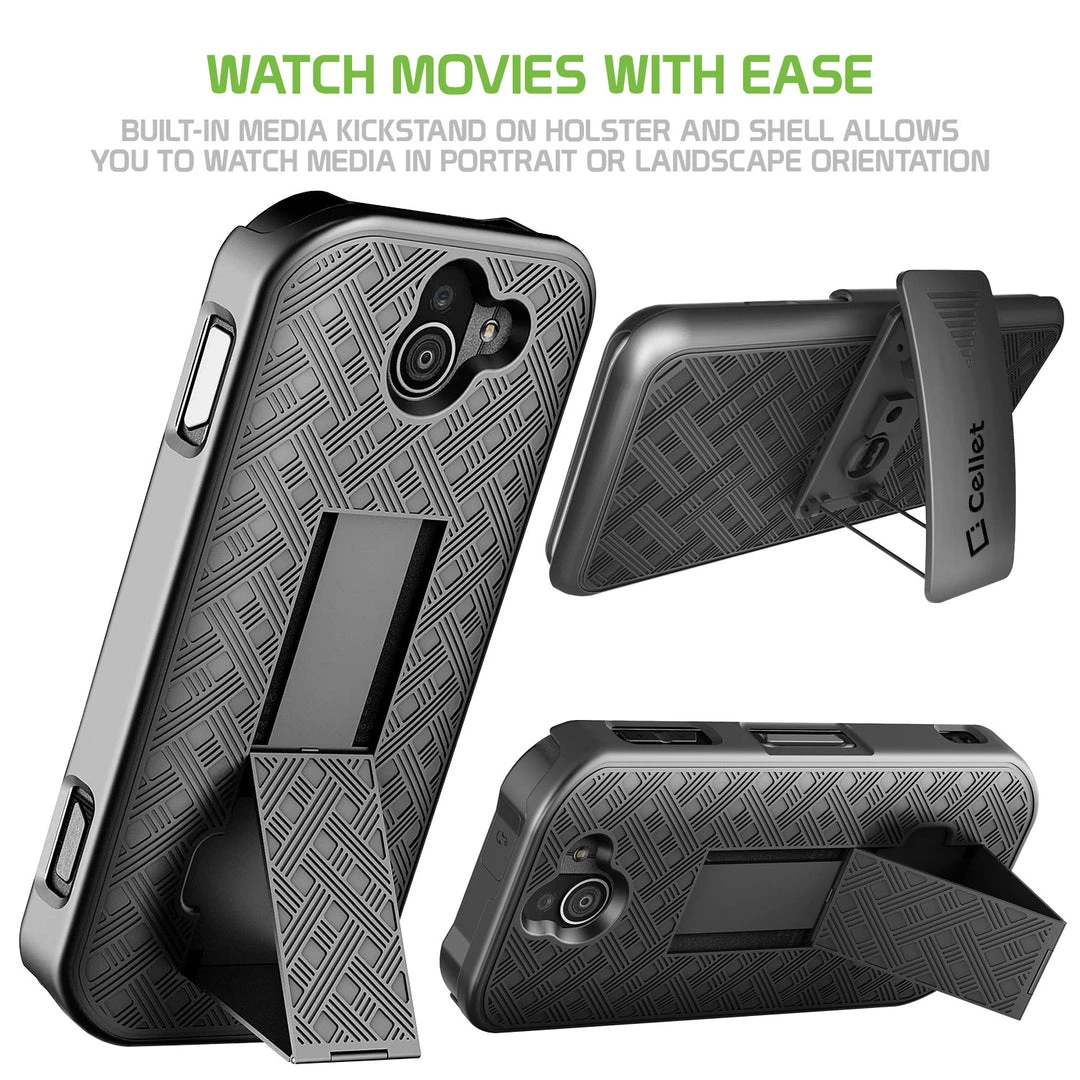 Combining protection with functionality, this shell plus holster case allows you to carry your device with ease while providing maximum all-around protection. Built-in media kickstand allows viewing in landscape (horizontal) or portrait (vertical) orientation. The case easily slips into the heavy-duty holster, so you can carry your phone either face up or face down. In addition, the belt clip includes 180-degree rotation capability so you can position the holster at any desired angle. The holster and hard shell combo case comes in all black and contains TPU, rubberized soft coating, which aids as an extra step of precaution against accidental cosmetic damage. Look no further! The slim profile and the multi-functionality of this product merge style, versatility, and supreme protection.