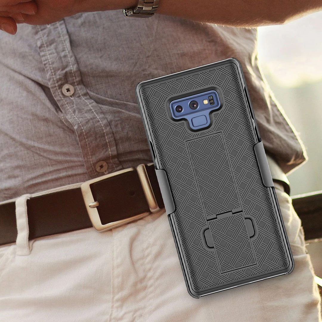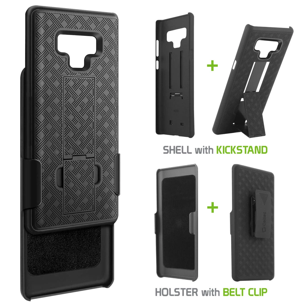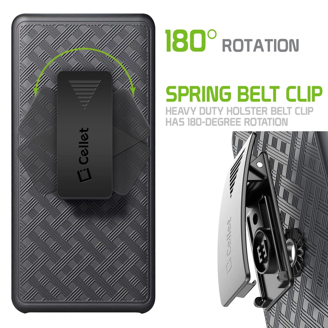 Combining protection with functionality, this shell plus holster case lets you carry your device with ease while providing maximum all-around protection. Built-in media kickstand on the holster and shell allows viewing in landscape (horizontal) or portrait (vertical) orientation and the heavy-duty clip has 180-degree rotation. Rubberized finish and cross-checkered design act as an extra precautionary step against accidental cosmetic damage. The slim profile and the multi-functionality of this product merge style, versatility, and superior protection.