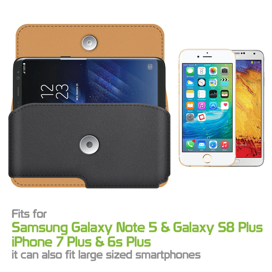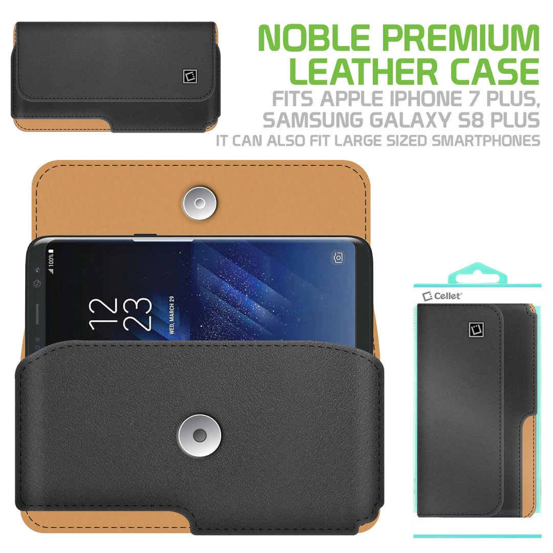 Carry your phone with class with the Cellet Horizontal Noble Leather Case. Made to fit Apple iPhone 7 Plus, and Samsung Galaxy Note 5, Samsung Galaxy S8 Plus, it can also fit large-sized smartphones such as Apple iPhone 6S Plus, Samsung Galaxy Note 4, and Samsung Galaxy S6 edge+. It is made with high-grade classic leather and has a secure magnetic flap. Attached is a fixed swivel clip with a 360-degree rotation capability that can be positioned to any desired angle.Â