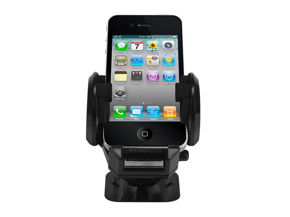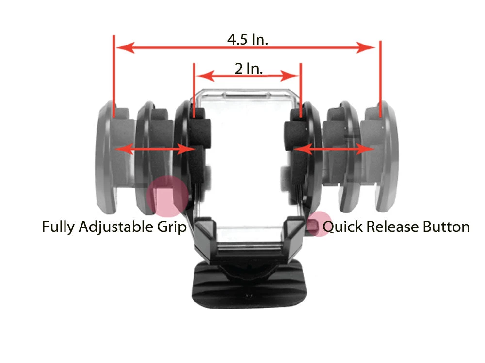 Hold your phone in plain sight as you drive with the Cellet Phone Holder. Equipped with a quick release button, soft side arms and backing, this holder can accommodate phones up to 2.5 inches wide. The base can be moved up or down and the turn-lock knob ensures a sturdy position. The holder can be placed either on your dashboard by removing the adhesive cover or you can attach the enclosed air vent brackets and insert it in your car vent.