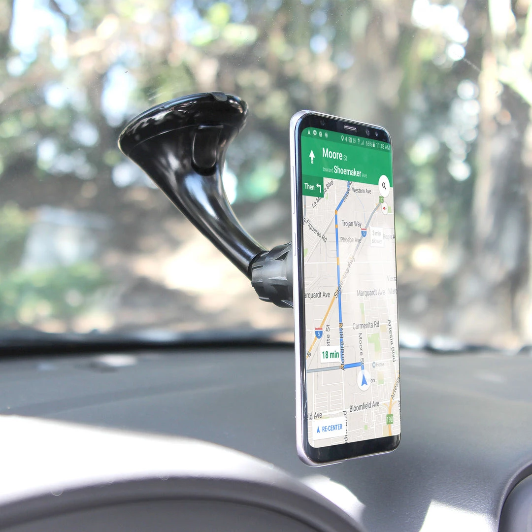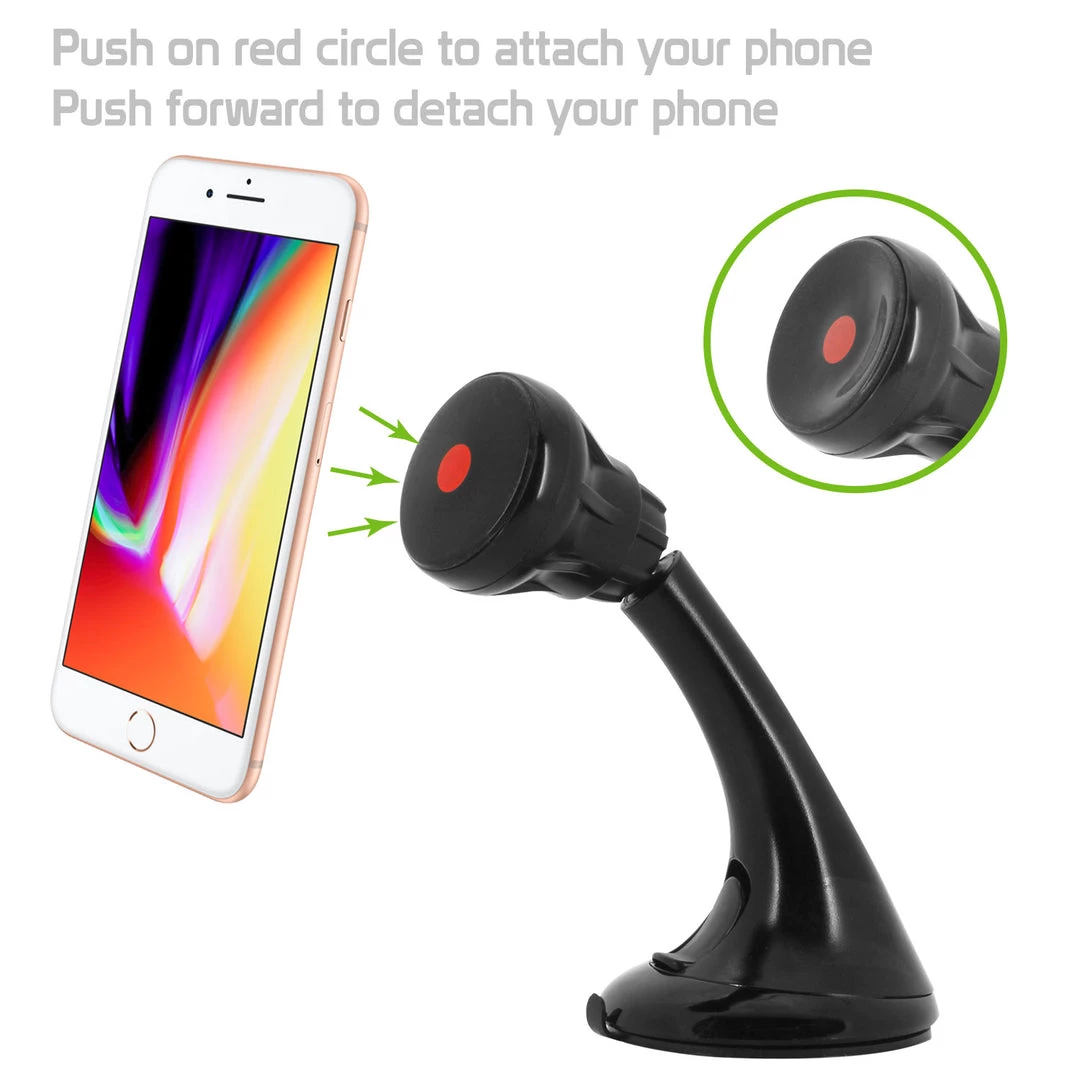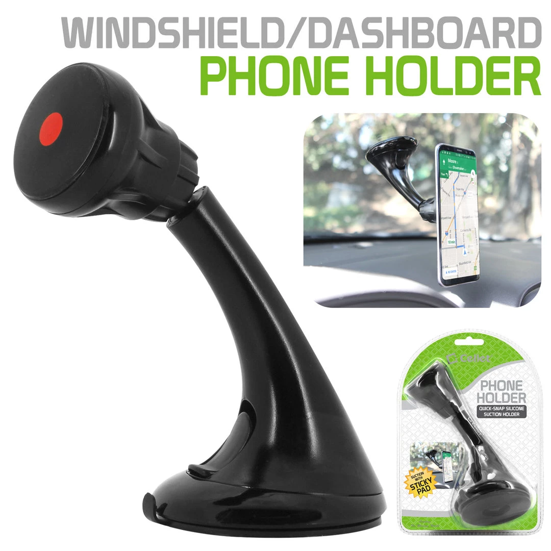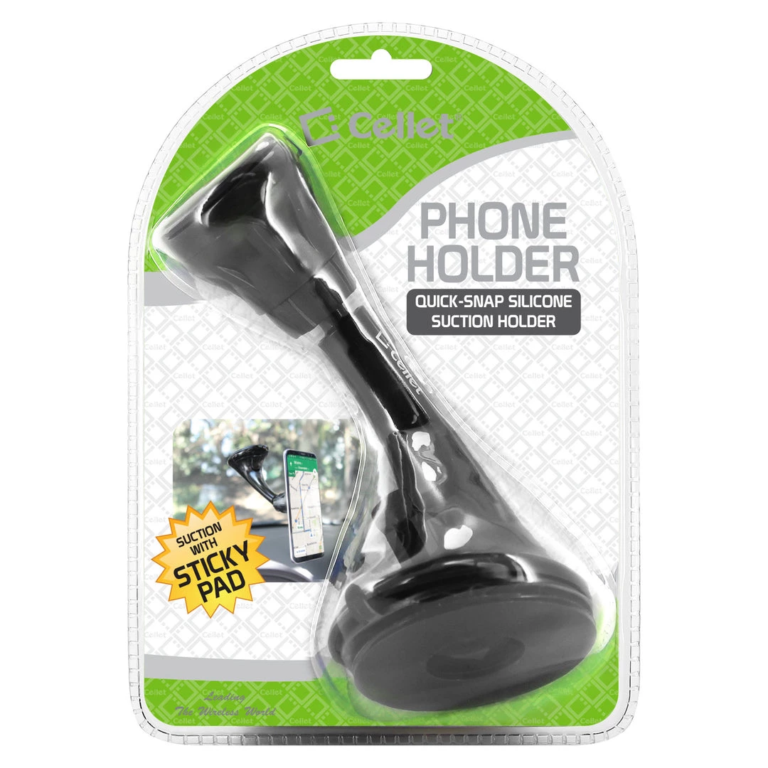 Mount your phone securely with the Cellet Extra Strength Suction Cup Phone Holder Mount. Featuring an extra-strength suction cup holder, the mount can hold any sized smartphone securely. Included in package are: a sticky pad with strong 3M adhesive glue, 360 degree swivel/ turn base and dial. Featuring quick snap technology, simply push on the red circle that is on the dial and attaches your device; your device can be positioned at any desired angle. The sticky suction cup will hold your smartphone and holder firmly in place either on your dashboard or windshield.