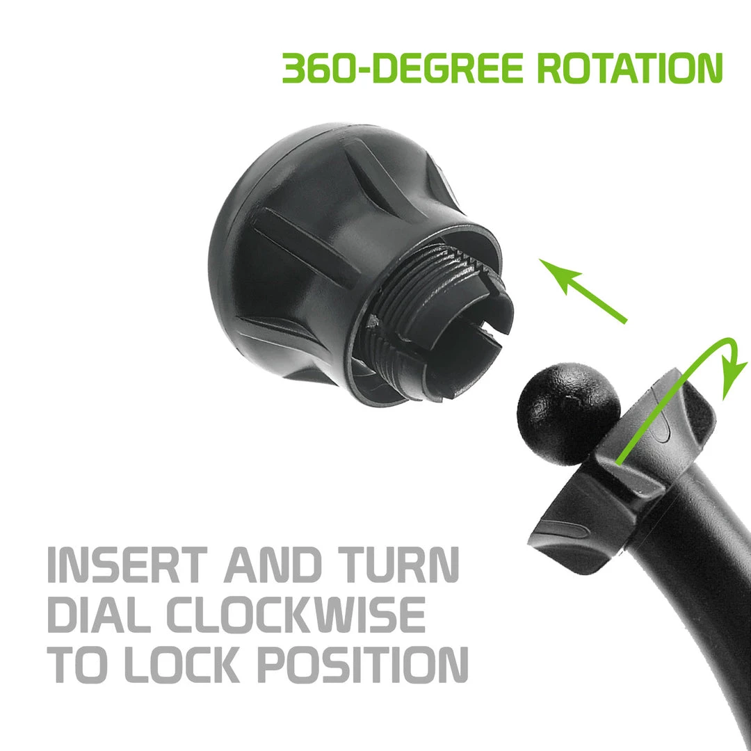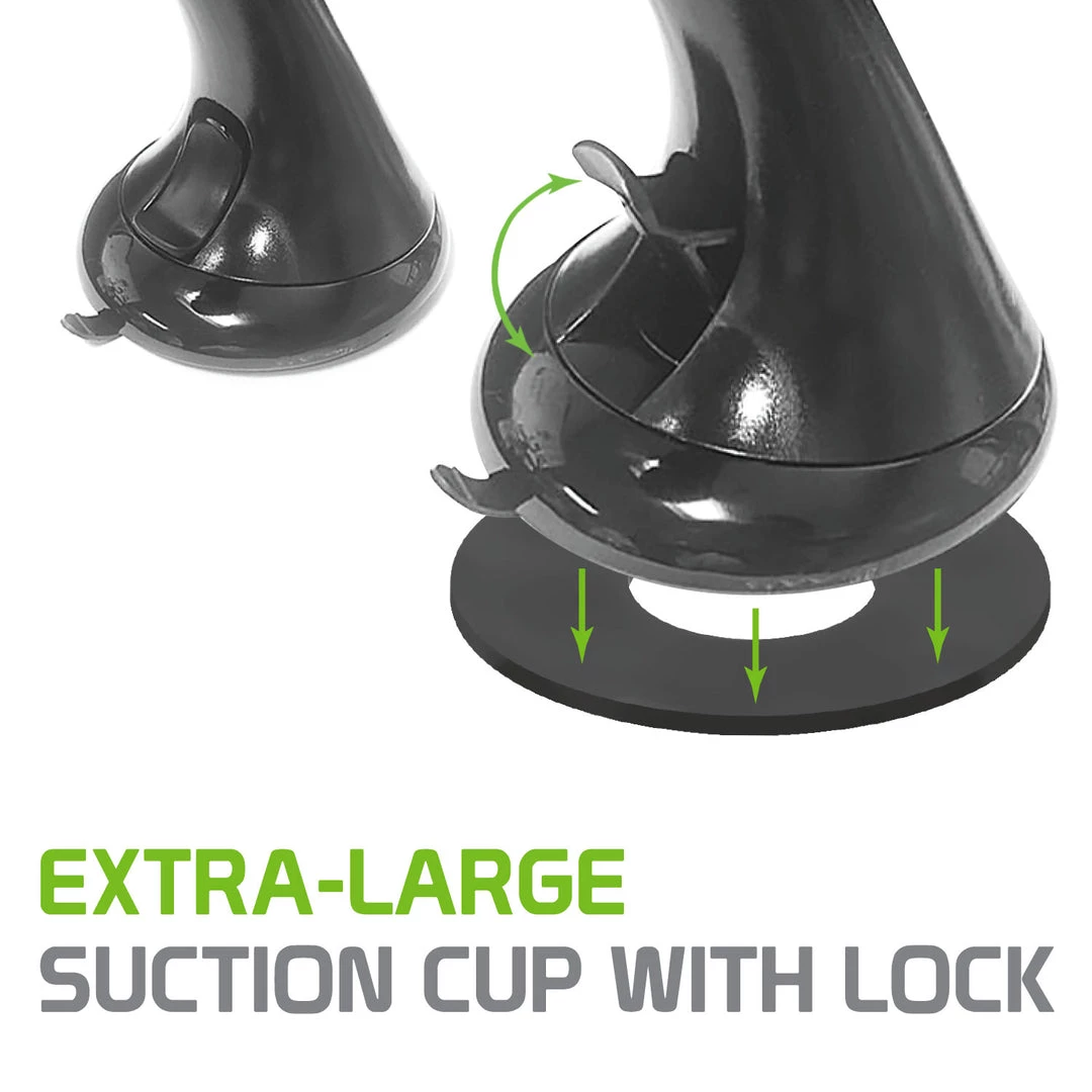 - Suction cup with lock lever secures base onto your dashboard or windshield