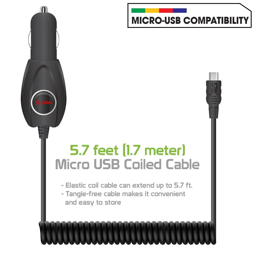 The Micro USB Coiled Cable Car Charger provides power to your device to keep you connected when the battery is low. The slim, compact, and lightweight charger minimizes any bulk inside your car and makes it easier to store. The micro USB charger is a convenient solution for charging your device when traveling. Equipped with an attached micro USB coiled cable, it allows your device to charge at rapid speeds. The elastic coil cable is tangle-free and can extend up to 5.7 ft. This coiled cable car charger is compatible with any micro USB-enabled device.