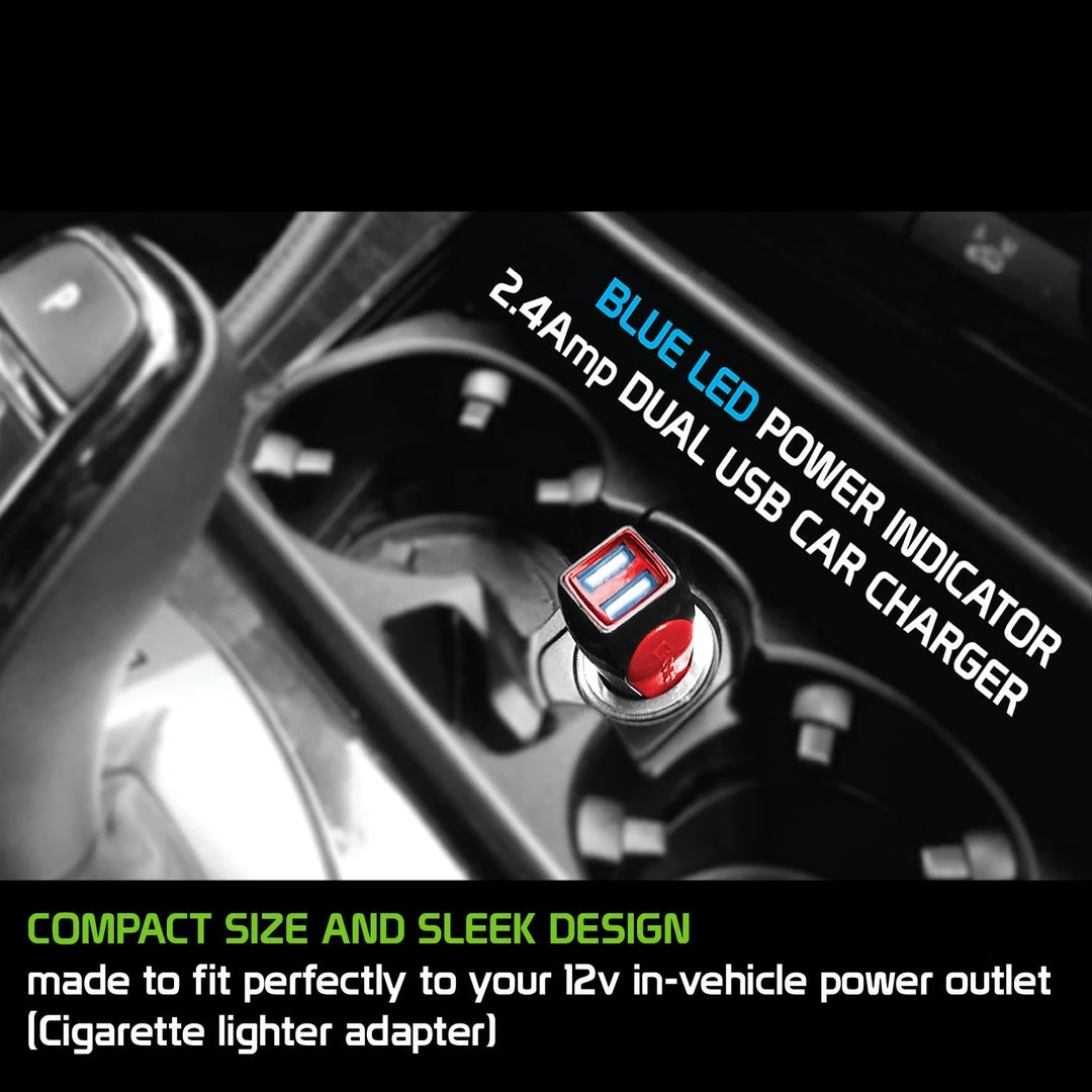 With its sleek compact design, it provides easy access to your USB ports while plugged into your car cigarette outlet and the blue LED light indicator shows that your device is plugged in and charging. The charger provides 12Watt (2.4Amp) of power that can charge up (to two) smartphones at the same time or a tablet with a smartphone. The built-in smart IC chip technology prevents your device from overcurrent, overcharging, and overheating. Use the included micro USB cable to charge your micro USB compatible device and your iPhone or iPod simultaneously (Apple cable not included). The dual USB ports are compatible with any USB-ready device.